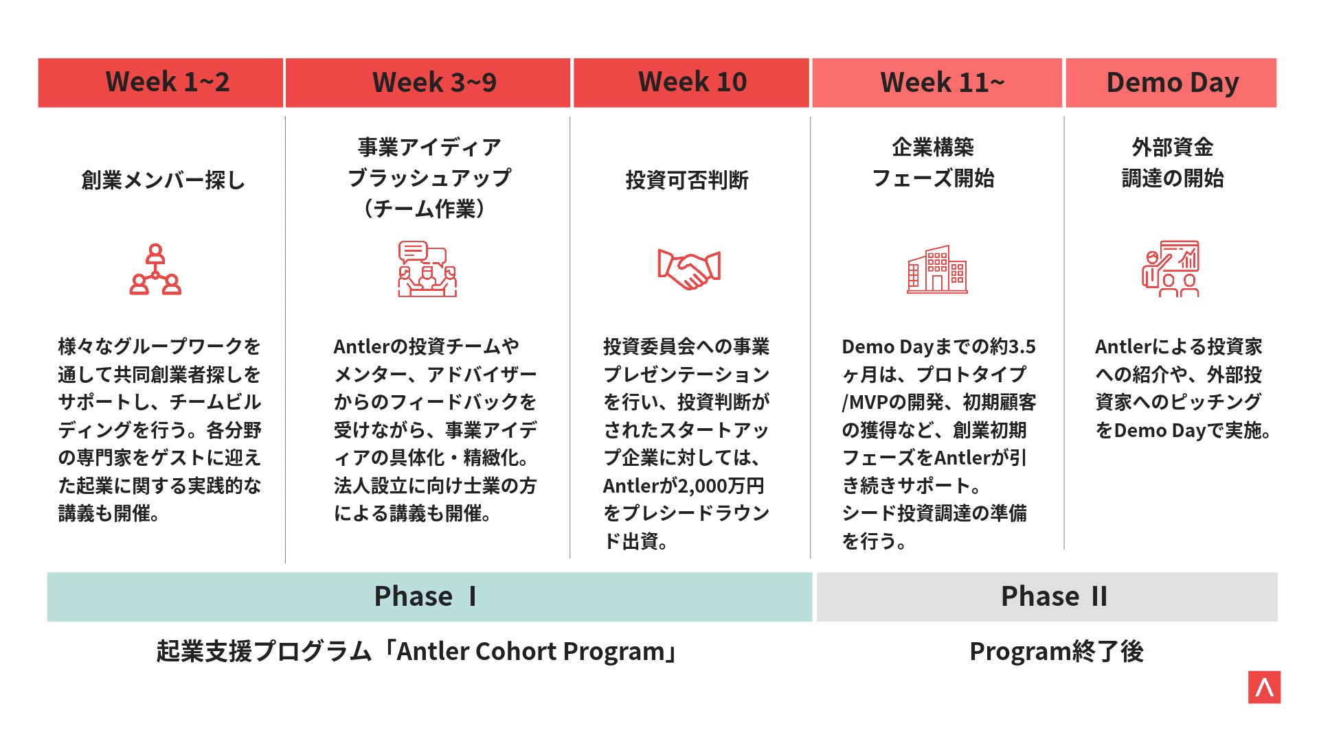 Antlerは起業支援プログラム「Antler Cohort Program」を通して、創業前・アイディア段階の“Day Zero”から起業家を支援しています。共同創業者探し、チームビルディング、事業アイディアの精微化、2,000万円のプレシードラウンド出資、事業拡大支援、フォローオンのシリーズC出資まで一気通貫で支援を行っています。