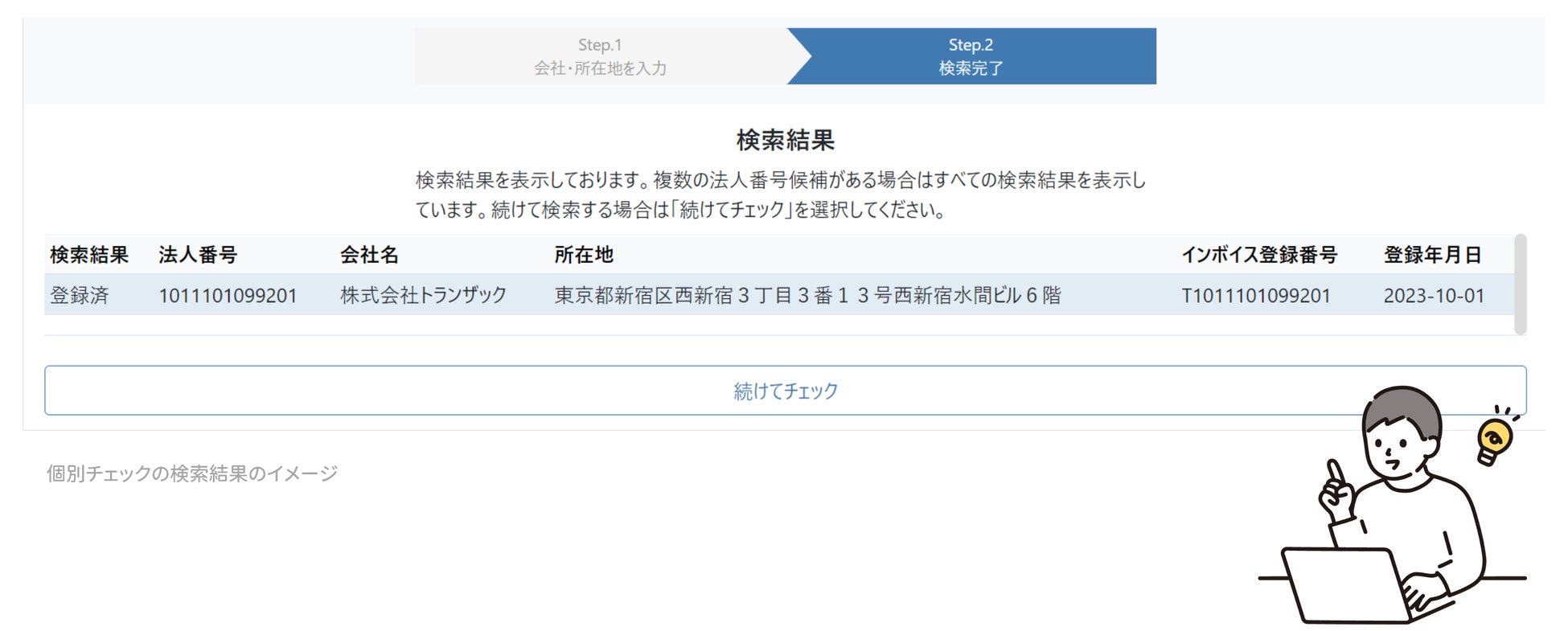 会社名から取引先のインボイス登録状況を個別にサクッと確認できます。