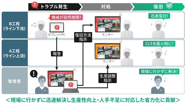 AccelVisionを活⽤することで、タブレットPCなどを通じてトラブルの把握や解消に向けた迅速な意思決定、復旧作業の指⽰ができ、効率的な⼯場運営が可能となります。また、管理者と製造現場との間のコミュニケーションを円滑化することで、管理者の省⼒化や現場間の移動ロスを削減するなど効率化も期待できます。