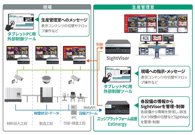 エッジプラットフォーム装置Estinargy(エスティナジー)*は、各種⽣産設備からの情報(設備やセンサーからのアラームなど)を受信し、SightVisor(サイトバイザー)*に対し、平常時の映像表⽰画⾯から異常発⽣箇所の映像やデータ情報画⾯に⾃動切替制御を行い、テロップ表⽰にて管理者に異常状態を通知します。同時に製造現場においては、外部制御ツール*をインストールしたタブレットPCにより、管理者とのコミュニケーションを行うことができます。