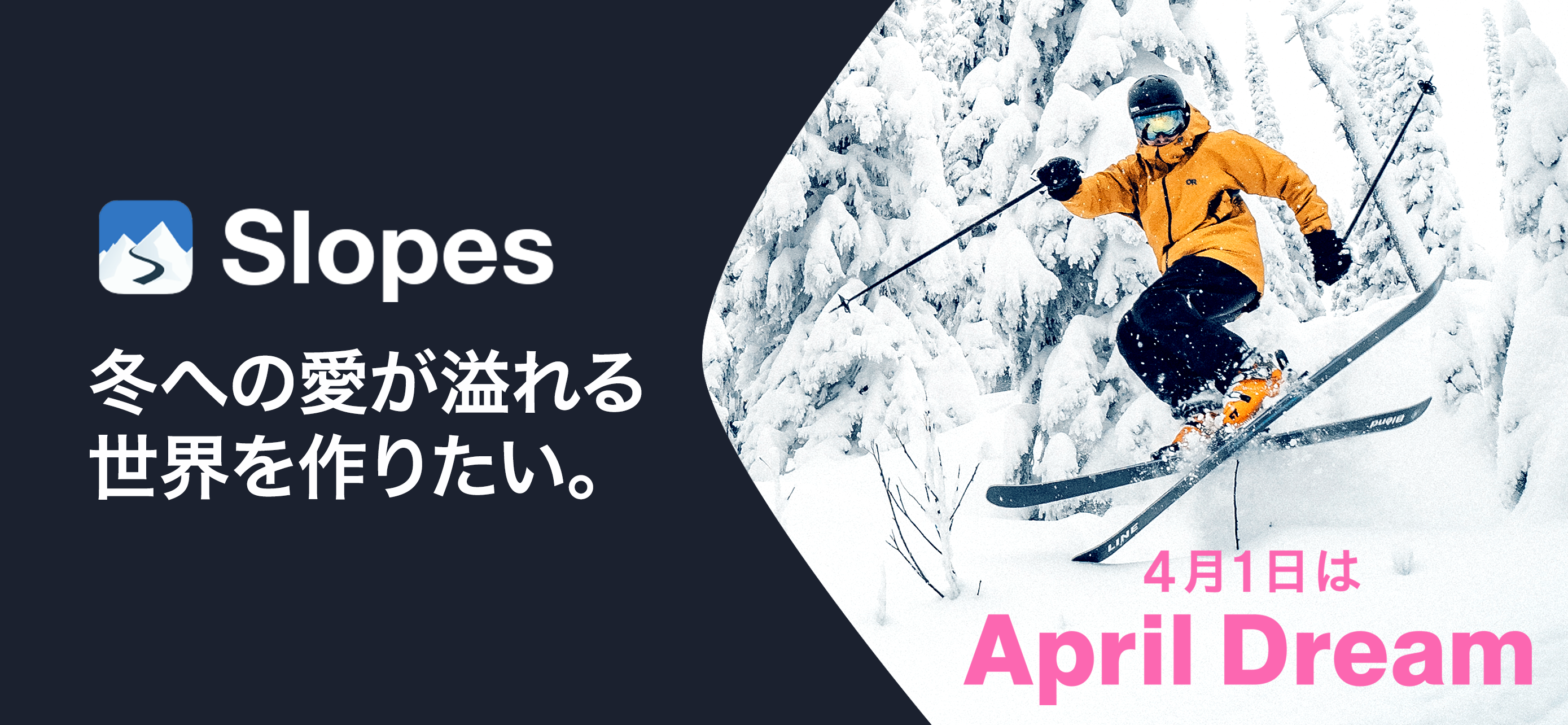 スキー・スノーボードの滑走記録アプリ「Slopes」の開発・運営を行うBreakpoint Studio LLC.(ブレイクポイントスタジオ、所在地:アメリカ合衆国 コロラド州、代表:Curtis Herbert)は、4月1日を夢を発信する日にしようとするApril Dreamに賛同し、「ウィンタースポーツを盛り上げ、スキー人口を2倍にする」という夢を掲げました。