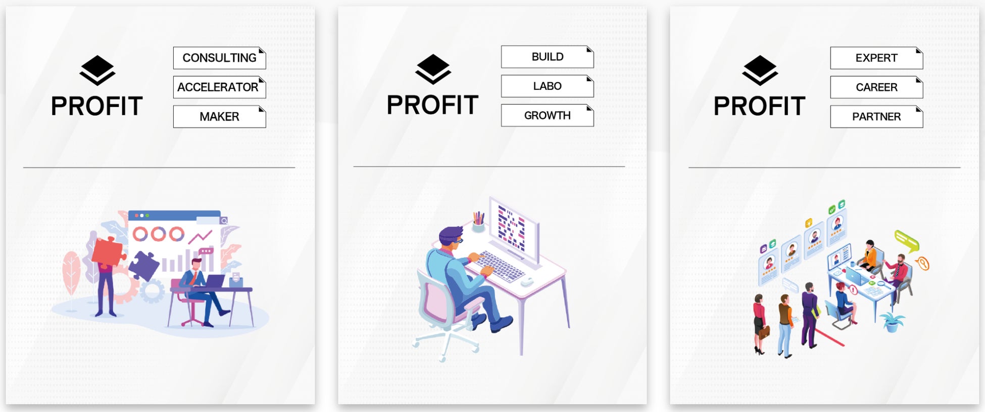 サイト上では、ProfitMakersの3つの事業領域を整理しました。企業の成長をさまざまな角度からサポートする弊社の取り組みを詳細に紹介しています。