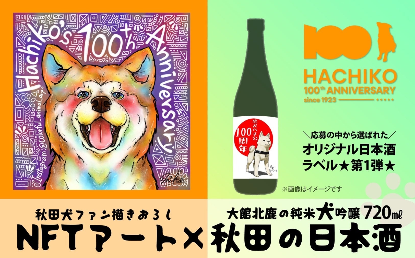 株式会社Meta Akita( https://akitainu-hozonkai.com/metaakita/ )と秋田県大館市は、同市のふるさと納税返礼品として、ハチ公生誕100年を記念した限定NFT(デジタルアート)とオリジナル日本酒のセットを提供しています。本NFTと日本酒ラベルのデザインは、Meta Akitaコミュニティ及び、世界の秋田犬ファンによる応募作品から採用されており、第1回募集時にはたくさんのご応募をいただきました。