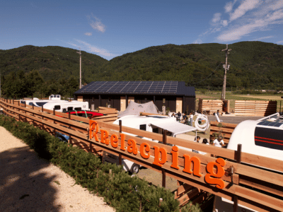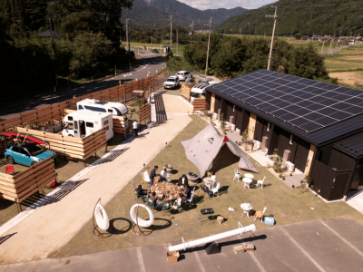 滋賀県高島市のメタセコイア並木から車で3分のところに位置する「Reacping」は、キャンプ泊利用だけでなく、貸切風呂やEVバイクレンタルを初めとしたサービス提供をしている複合型のRVパークです。また、各施設の電力は太陽光発電によって生み出された再生可能エネルギーを使用しており、環境にも配慮したサステナブルな施設です。