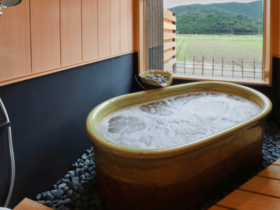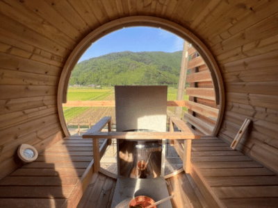 当施設は敷地内に貸切風呂と貸切サウナが併設しており、田園風景を眺めながらお楽しみいただけます。また、2024年2/10には新たに五右衛門風呂と移動式サウナを増設し、より多くのお客様に整い体験をしていただけるようになりました。