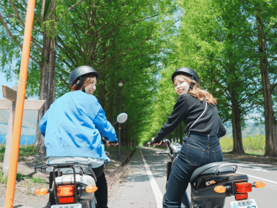 太陽光発電による再生可能エネルギーを動力とするEVバイクサービスです。原付〜中型までお持ちの免許証に合わせて選べるバイクでメタセコイア並木観光など周辺スポットを散策できます。小回りが効きやすく、エンジン音が静かなため普段バイクに乗り慣れていない方でもお気軽にご利用いただけます。