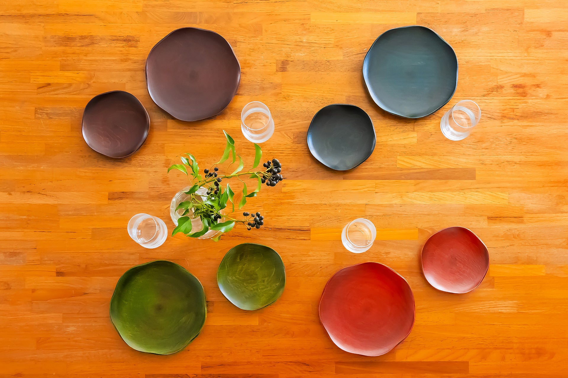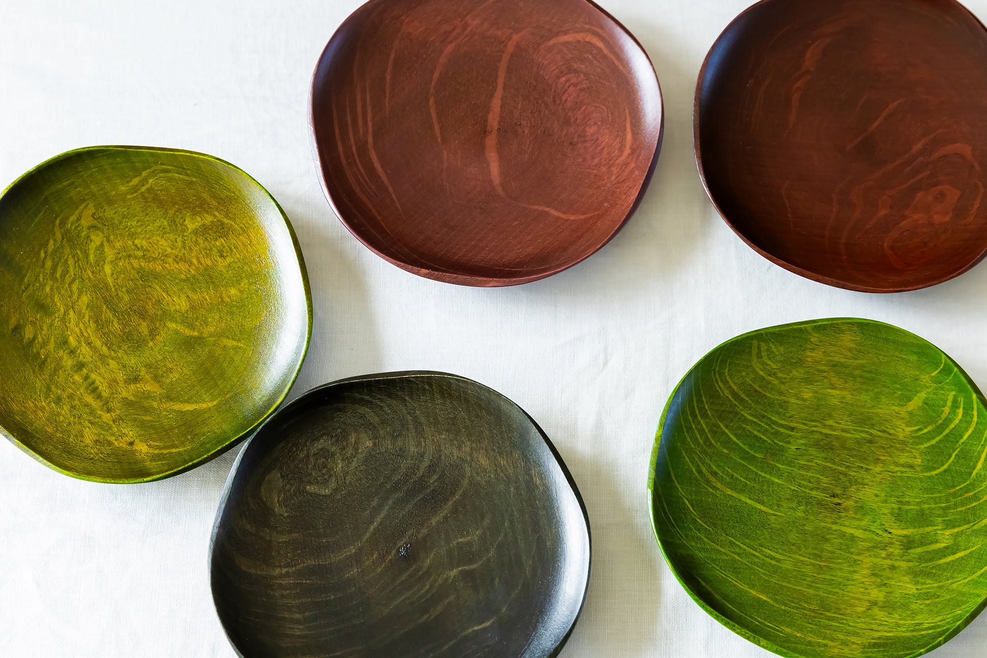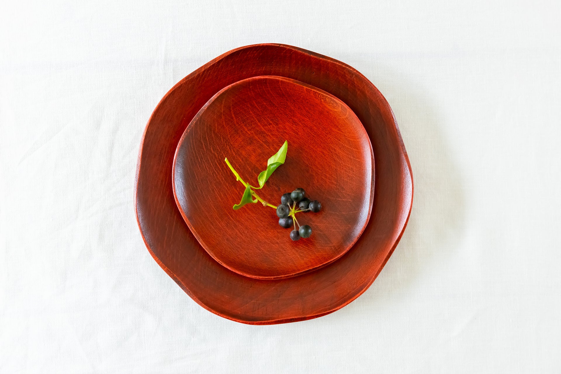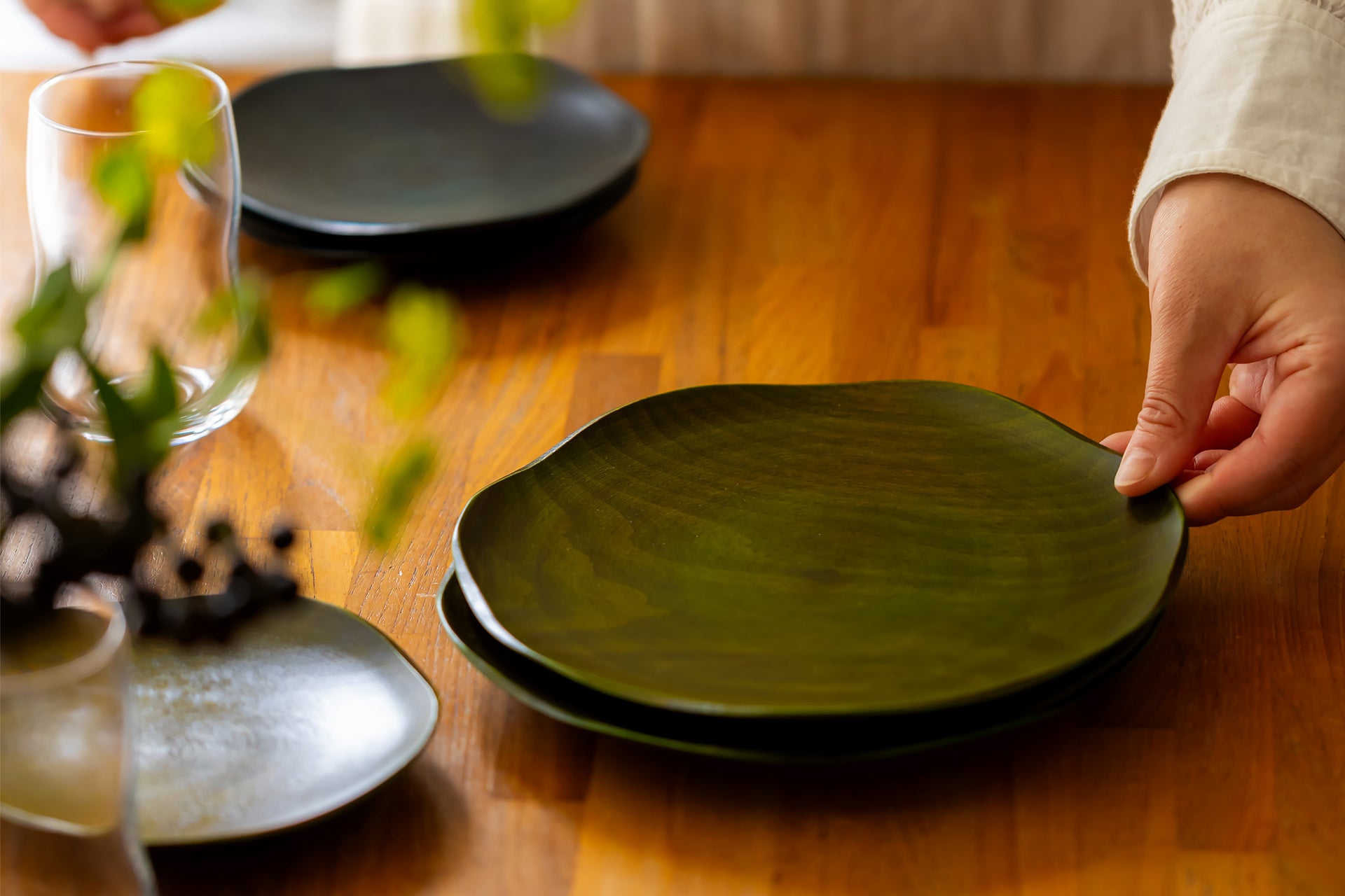 洋食器のような重ね使いを木製漆器でも体験できるように、大小でフリルの数を変え、影が美しく見えるデザインに仕立てました。色違いで重ねてみたり、季節にあわせて色を変えてみたり。装飾性の高い器なので、少ない小物でも雰囲気よく食卓が整います。