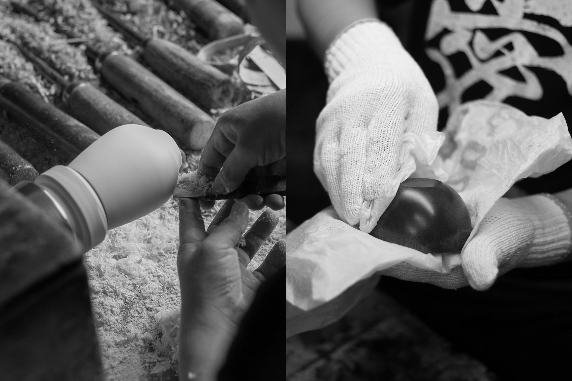 「塗りの輪島」「蒔絵の金沢」に並ぶ「木地の山中」として、山中は挽物木地では全国一の生産量を誇る地域です。⽣産過程には、ろくろを挽く⼈、漆を精製する⼈、下塗りをする⼈、漆を拭き取る⼈など表には⾒えないたくさんの⽅の⼿が加えられています。多くの職人の想いに支えられている伝統工芸だからこそ、山中の人と自然と文化を主役に、暮らしのクオリティを高めるものづくりに取り組んでいます。