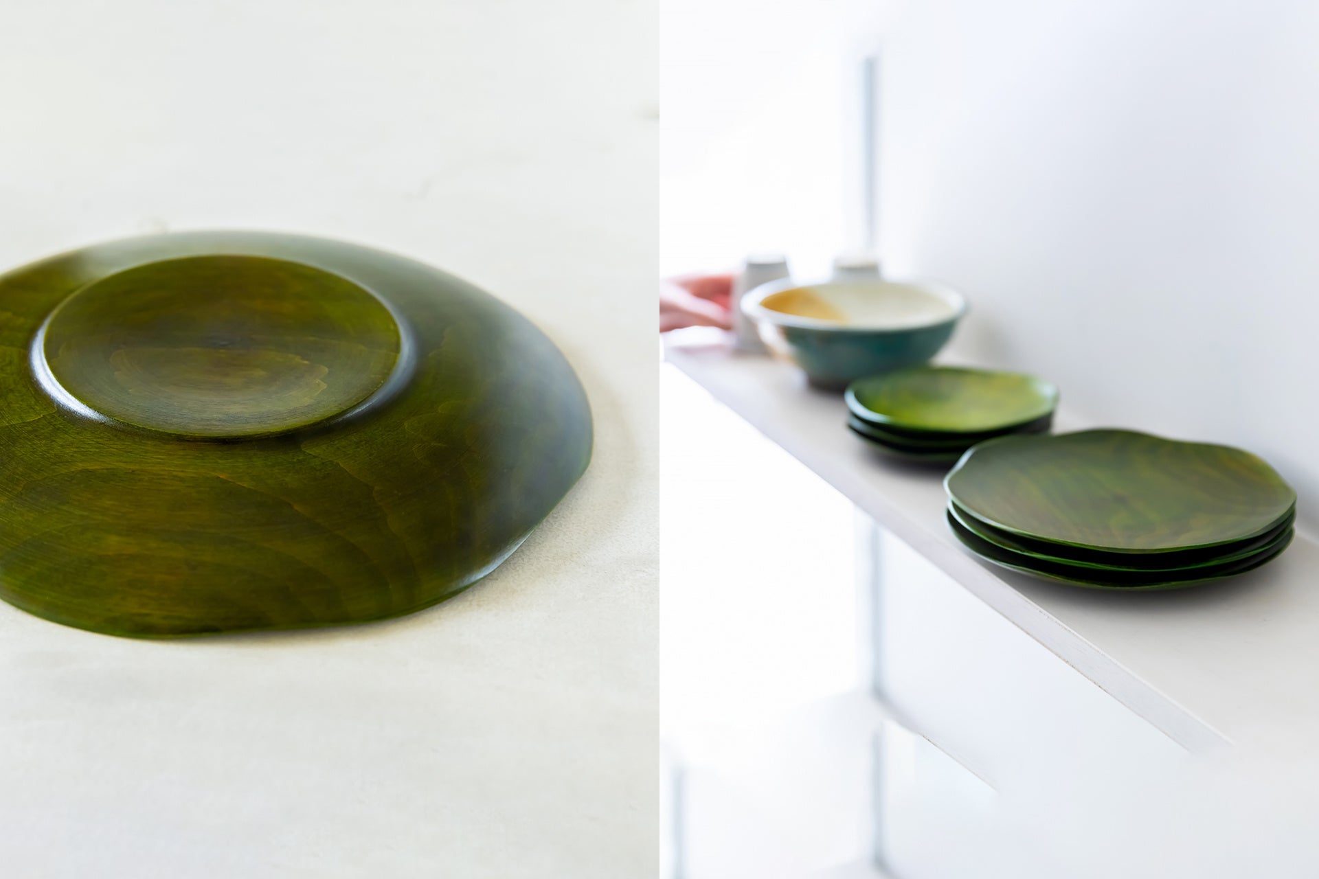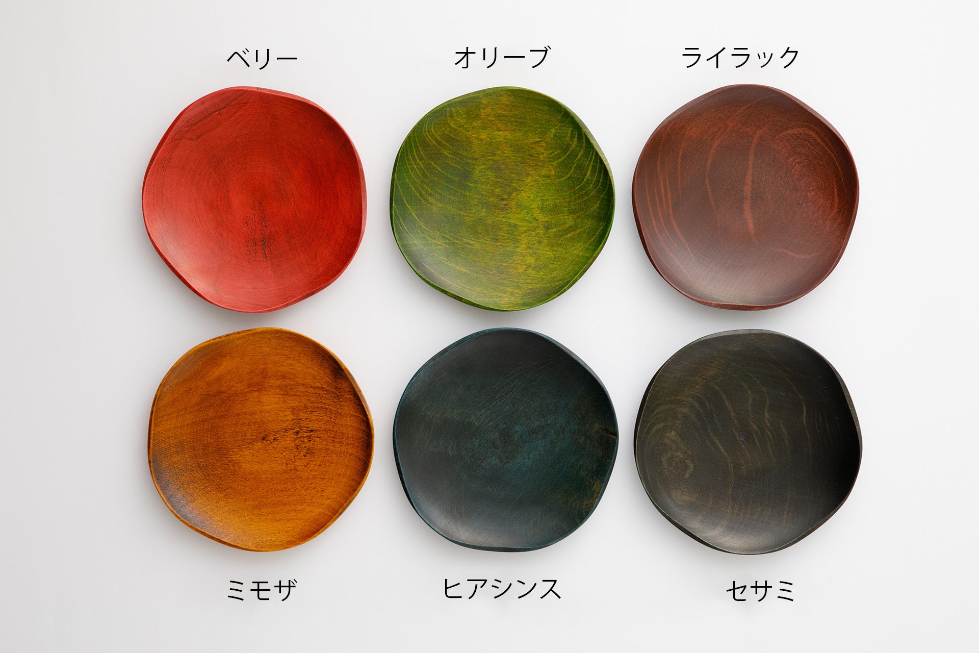 木地=木目模様を生かした自然な風合いが魅力の山中塗。本商品では、植物のようなフォルムに近づけるため、挽物の木地師が木工旋盤を用いてプレートの形に削り出し、最後は手彫りで木地を整え、花のような曲線を表現しました。