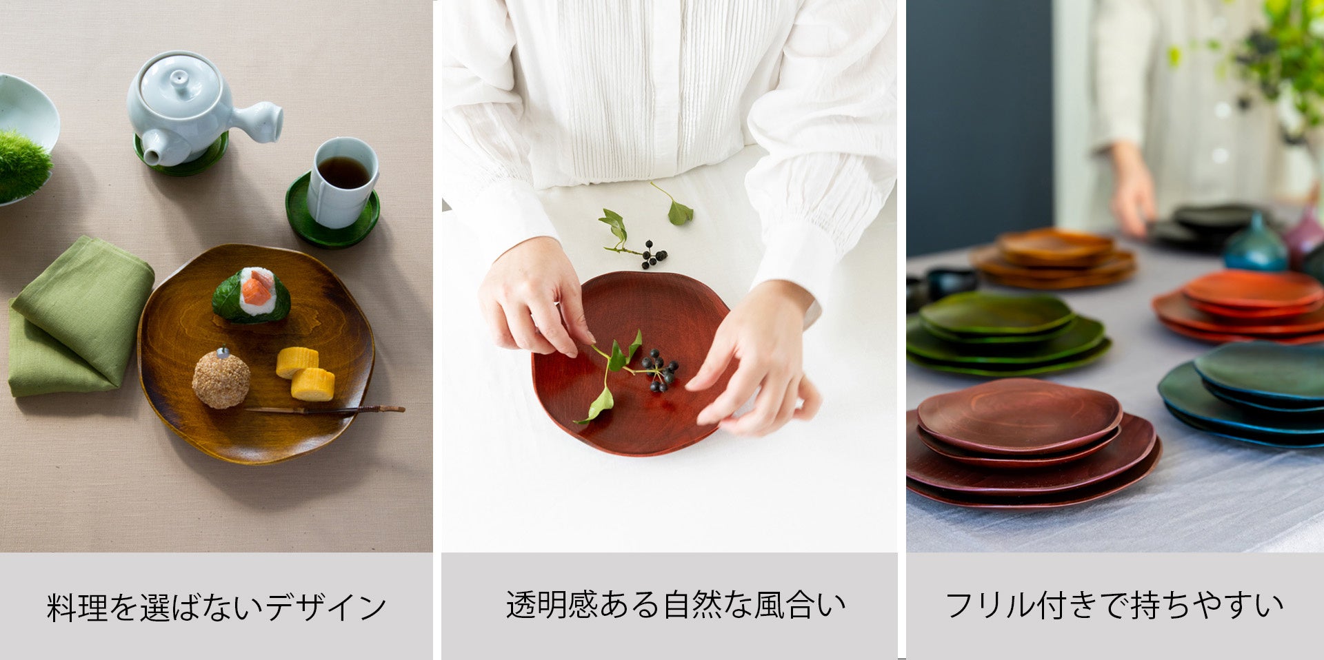 全国一の木地ろくろ挽きの産地「山中」の職人技から生まれた、装飾性と使い心地を追求したプレートです。漆器がある暮らしをもっと気楽に、自由に楽しんでほしいという想いで木製漆器の可能性と魅力を引き出しました。