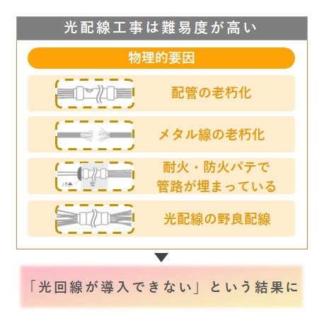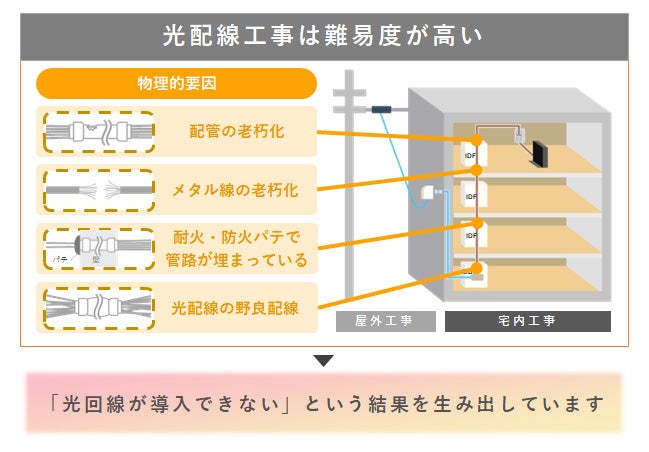 また、光配線方式の設備を既存マンションに導入するには光ファイバーを宅内に引き込む必要があり、そのための配管が備わっているかが導入にあたり大きなポイントになります。既存マンションでは光ファイバーのための配管が備わっていない場合が多く、配管が備わっている場合でも、過去の工事等によって光ケーブル通線用配管の管路が埋まっていたり、配管内に使用されていない配線が放置されているため通線が出来ないなど、マンションインターネットがVDSL方式から光配線方式へアップデートするにあたって大きな妨げになっています。
