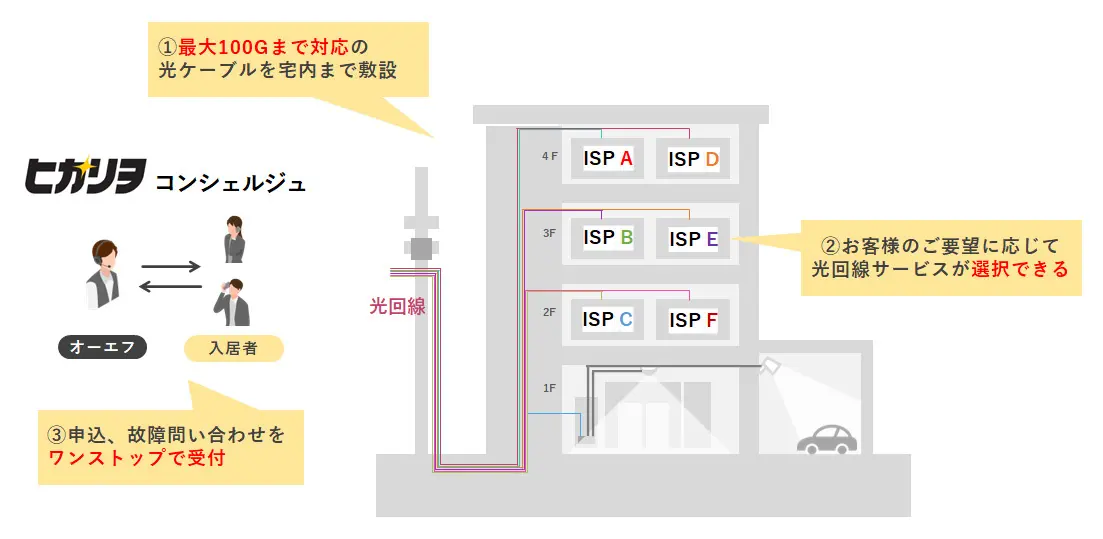 特徴3.マルチキャリアサービスでは、契約の受付や変更、問合せ対応などの窓口業務をキャリア各社が行うのが一般的ですが、ヒカリヲでは窓口を当社に一本化することで、入居者はストレスなくサービスをご利用いただけます。
