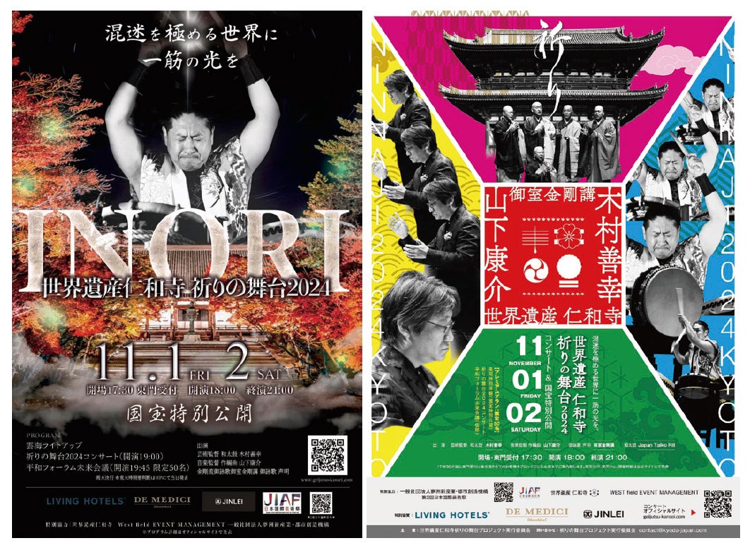 和太鼓 津軽三味線二刀流演奏家 木村善幸が芸術監督として平和の祈りをテーマに新しい芸術価値と創造を。また日本至極の作編曲家 山下康介氏を音楽監督に迎え、和太鼓・オーケストラサウンド・御詠歌の新創造世界を。新たな山下サウンドを仁和寺から発信します。