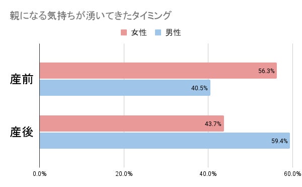 加熱寿司公式アカウントでの調査の結果、女性の過半数が「妊娠中に親になる気持ちが湧いている」一方で、男性の過半数は「出産後に親になる気持ちが湧いている」ことがわかりました。