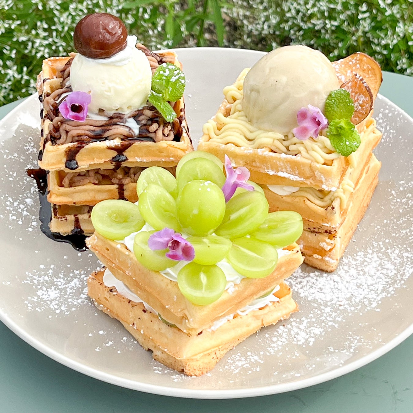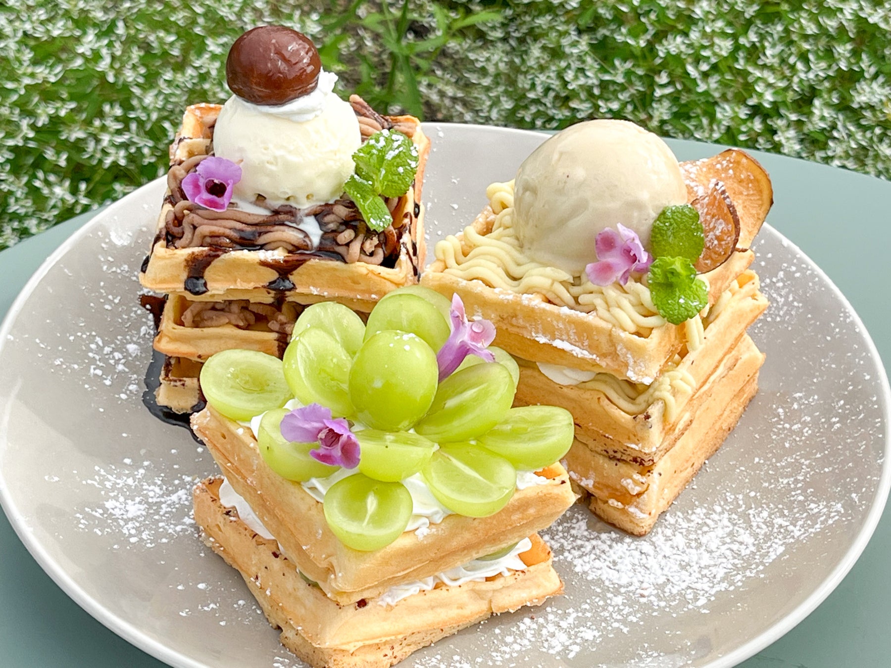 ・シャインマスカットワッフル…ぶどうの王様シャインマスカットがたっぷり。ぶどうの食べ納めはこれで決まり!