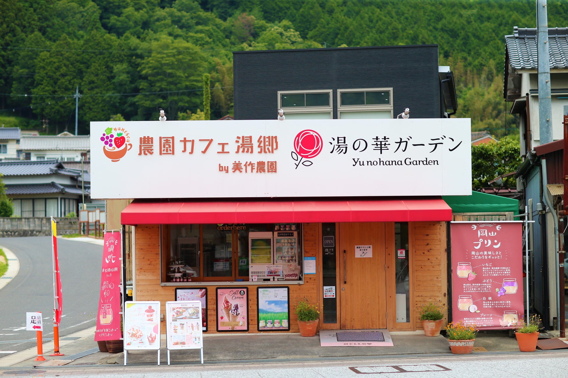 美人の湯として名高い湯郷温泉の中心部に2017年7月に誕生した「農園カフェ湯郷」。岡山県下最大級のぶどう・いちごの観光農園である美作農園が直営しています。美作農園は地元である湯郷温泉を自らの手で盛り上げていきたいと考え、自分たちで作った果物を使い自分たちの手で直接、湯郷温泉に来た観光客をもてなすカフェをオープンしました。