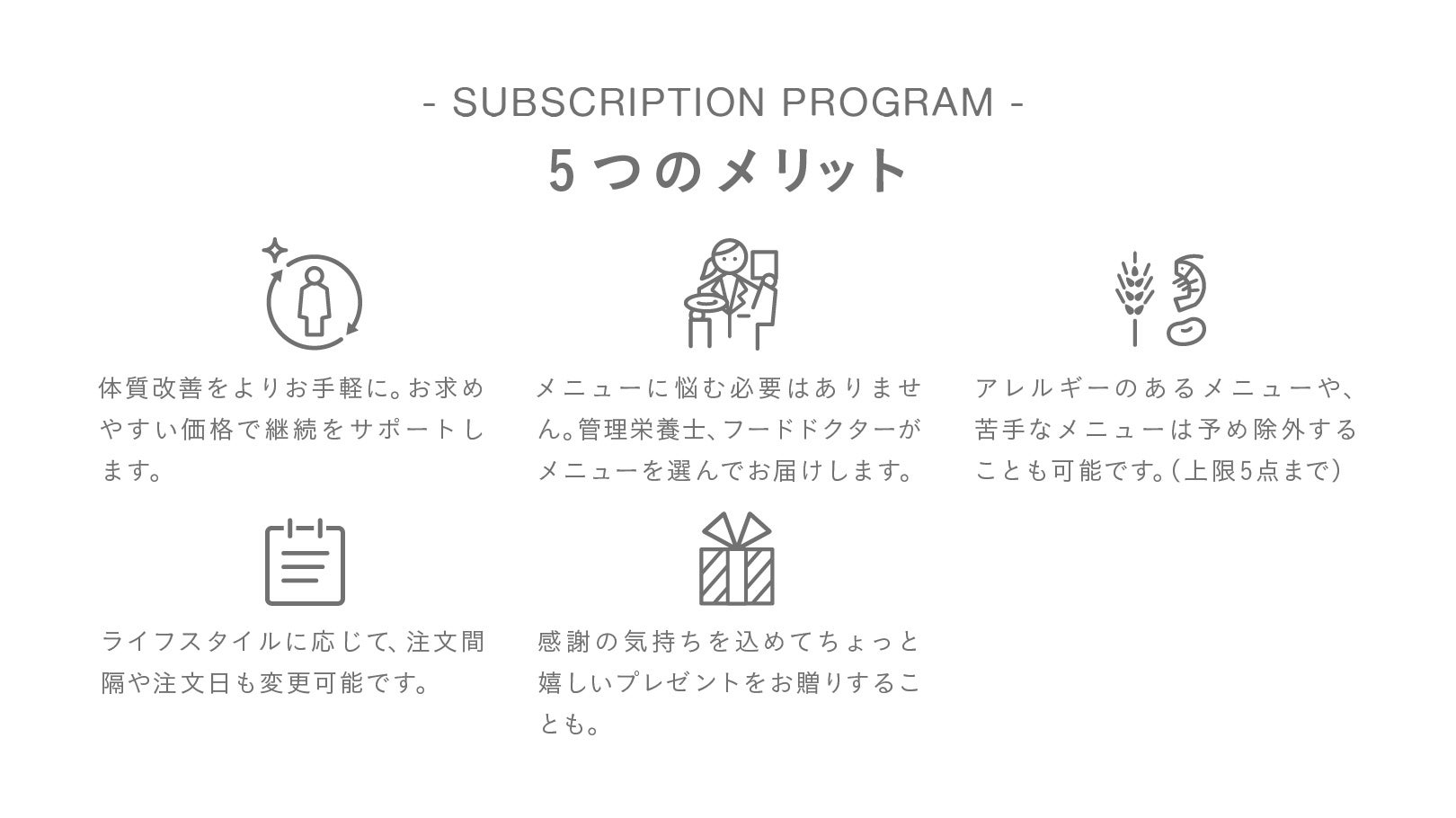 このたび&mealのサブスクリプションプログラムの一般販売を開始しました。メニュー選びに悩む必要もありません。管理栄養士とフードドクターが最適なメニューを選んでお届けします。さらに、アレルギーや苦手な食材は除外可能。ライフスタイルに合わせて注文間隔や日程の変更もOK。感謝の気持ちを込めて、特別なプレゼントも。体質改善をより手軽に、そしてお求めやすい価格で実現するチャンスです。