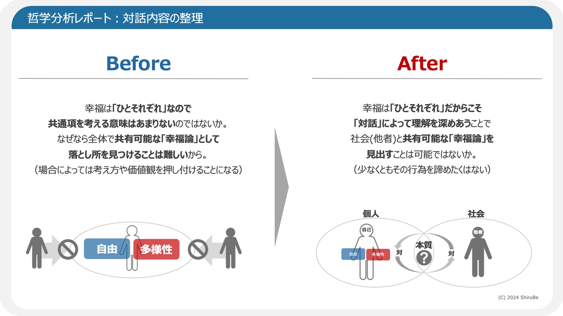 松村さん:哲学分析レポートでは、対話を通して考えが変化した“After”の、「ひとそれぞれだからこそ対話によって理解を深め合う」ということが印象的でした。対話の中では、些細なことで幸せを感じる人もいれば、私は幸せなんて感じませんという方もいたり(笑)、幸せの価値観はひとそれぞれだから考えても仕方ないと皆さんが思っていたところから、哲学対話で理解し合うことで「共通している幸福論もある」と思えるようになったので、レポートでも改めて価値を感じました。研修受講後も参加者の皆さんとテーマについての会話がはずんで、良い研修だったなと振り返って思います。