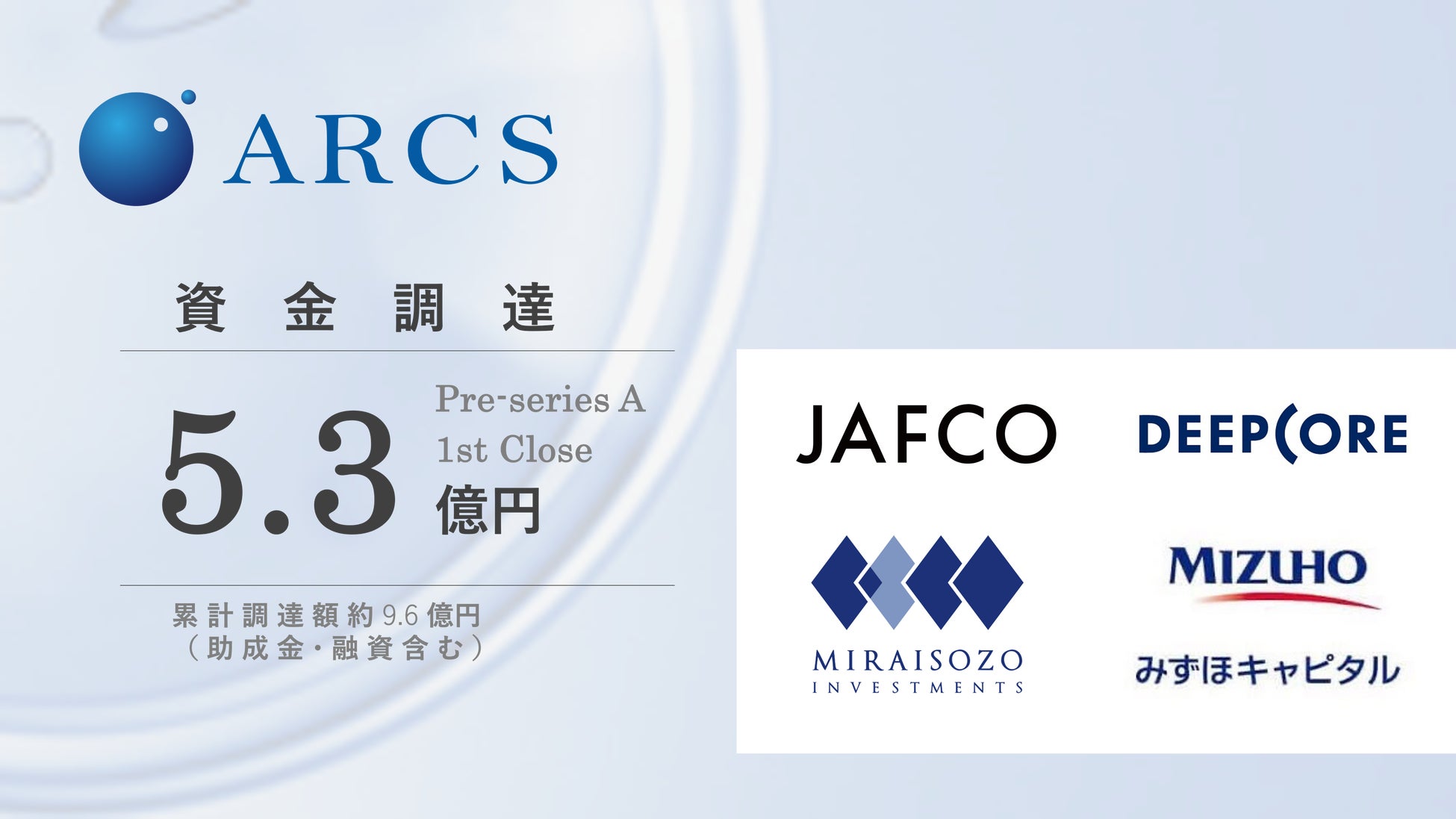生殖補助医療の自動化の実現を目指す株式会社アークス(本社:東京都渋谷区、代表取締役:棚瀬将康、以下「アークス」)は、プレシリーズAラウンド(1st close)で、約5.3億円の資金調達を実施いたしました。本ラウンドでは、新規投資家であるジャフコ グループ株式会社をリード投資家とし、既存投資家の株式会社ディープコア、株式会社みらい創造インベストメンツ、および新規投資家のみずほキャピタル株式会社を引受先としています。