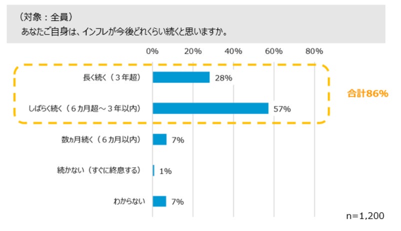 ✓ インフレは「長く続く(3年超)」「しばらく続く(6ヵ月超〜3年以内)」という回答は、合計で86%。