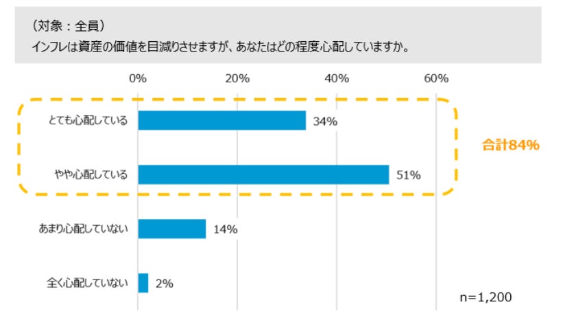 ✓ インフレが資産価値を目減りさせることを「とても心配している」「やや心配している」という回答は、合計で84%。
