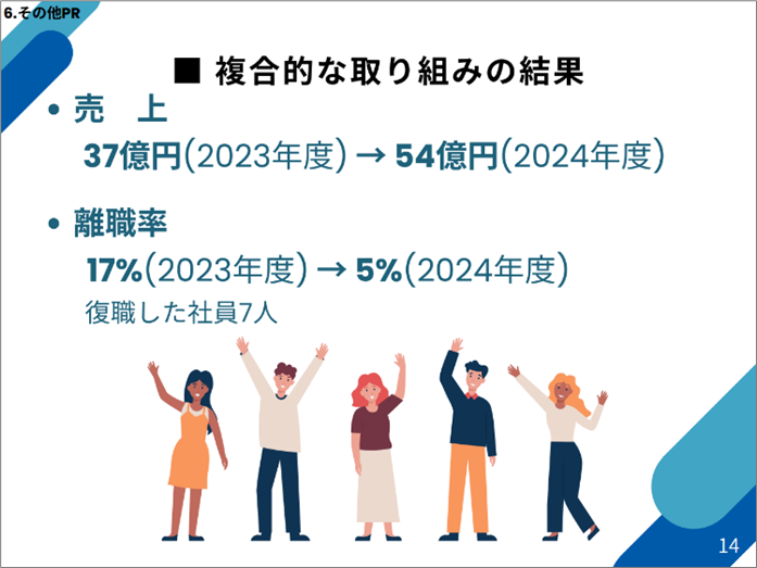 これらの複合的な取り組みにより、離職率の改善や業績の向上といった成果も生まれており、働き方改革が企業の持続的成長につながる好事例として評価されています。