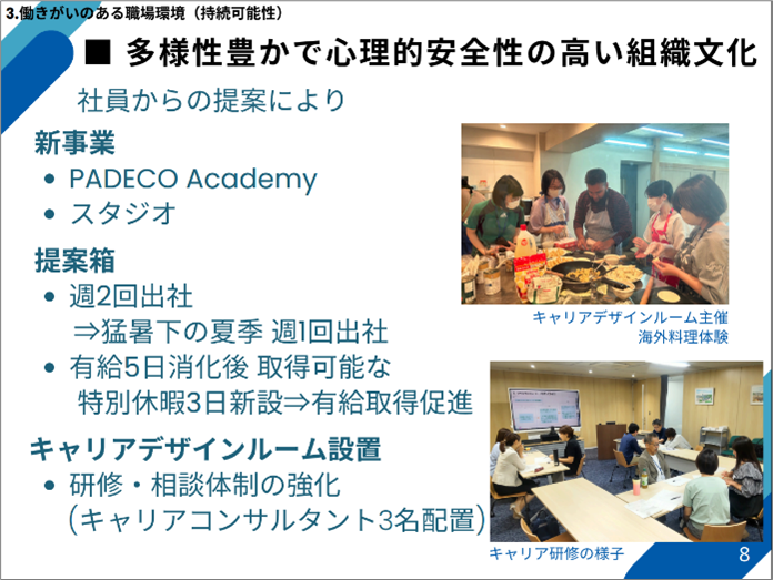 この賞は、多様で柔軟な働き方の実現に向け、先進的な取り組みを行う企業を表彰する制度であり、パデコは、独自の有給取得促進制度の整備と、それを実際に活かし続ける柔軟な制度運用の文化が評価されました。