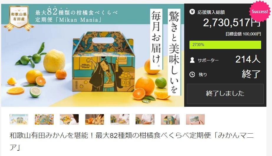 昨年9月に和歌山県有田産の最大82種類の柑橘食べくらべ定期便「Mikan Mania(みかんマニア)」をマクアケ(https://www.makuake.com/project/mikan_mania/)にて先行予約販売させていただき、おかげさまで214人のお客様に応援購入いただきました。
