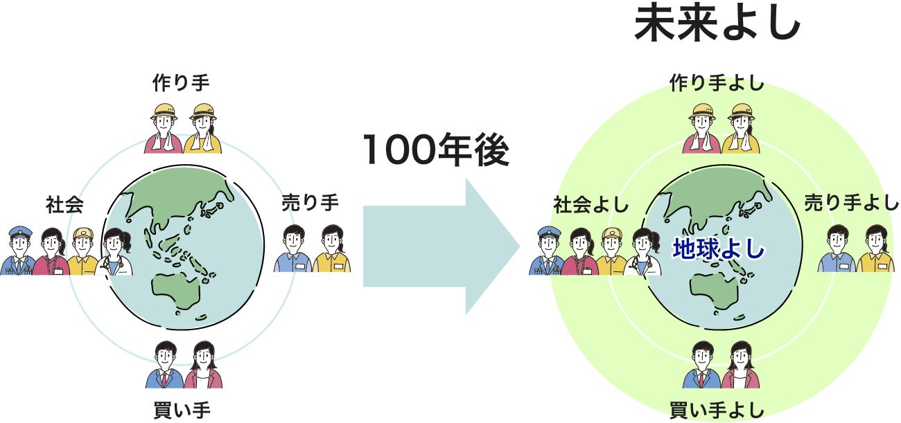 私たちは「農家さんが安心して農業を営める仕組みを創り続ける」をミッションに、作り手よし、売り手よし、買い手よし、社会よし、地球よし、未来よしの「六方よし」になる商品・サービスの開発・提供を行っています。