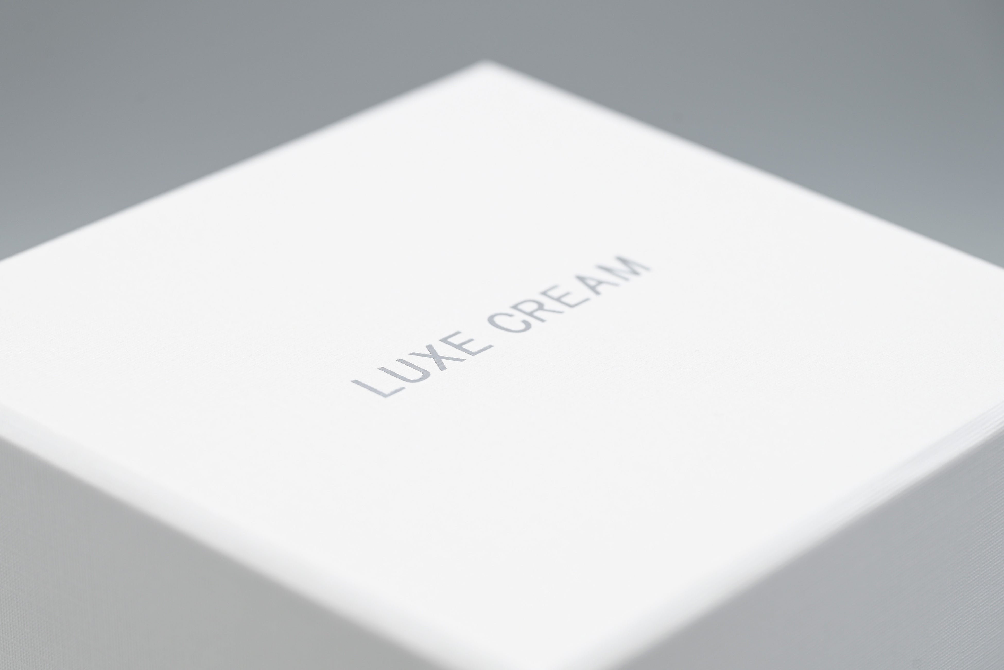 LUXE CREAMフェイスクリーム自体のプレミアム感に負けない、外箱に仕立てたいという思いから、クリスタルボトルの容器を宝石に見立て、指輪ケースからインスピレーションを受けたデザインに仕上げました。
