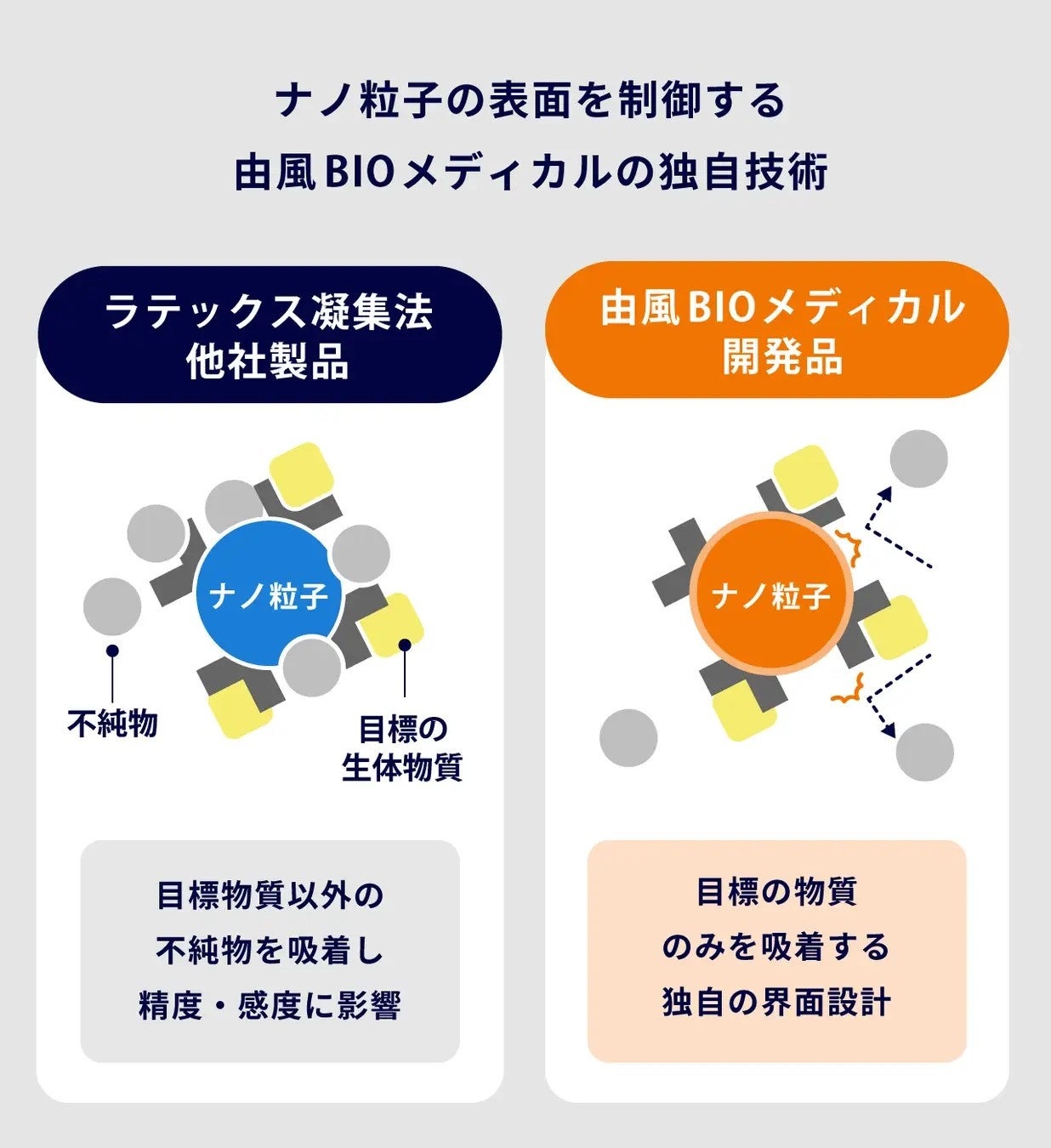 検査センター等に採用される自動機用免疫血清検査をターゲットにしています。現在主流のELISA法(酵素反応の発光を検出)は高感度であるものの検査に時間がかかります。ラテックス凝集法(ナノ粒子の凝集反応を検出)という方式は、迅速に結果がでるものの感度に課題があります。由風BIOメディカルは、ナノバイオロジー領域における独自のナノ粒子技術を応用し、ラテックス凝集法で感度と迅速性の両立を目指しています。これにより、検査医療の歩留まりの向上を実現し、疾病の早期発見と医療財政のリスク軽減(検査の低コスト化)に貢献します。