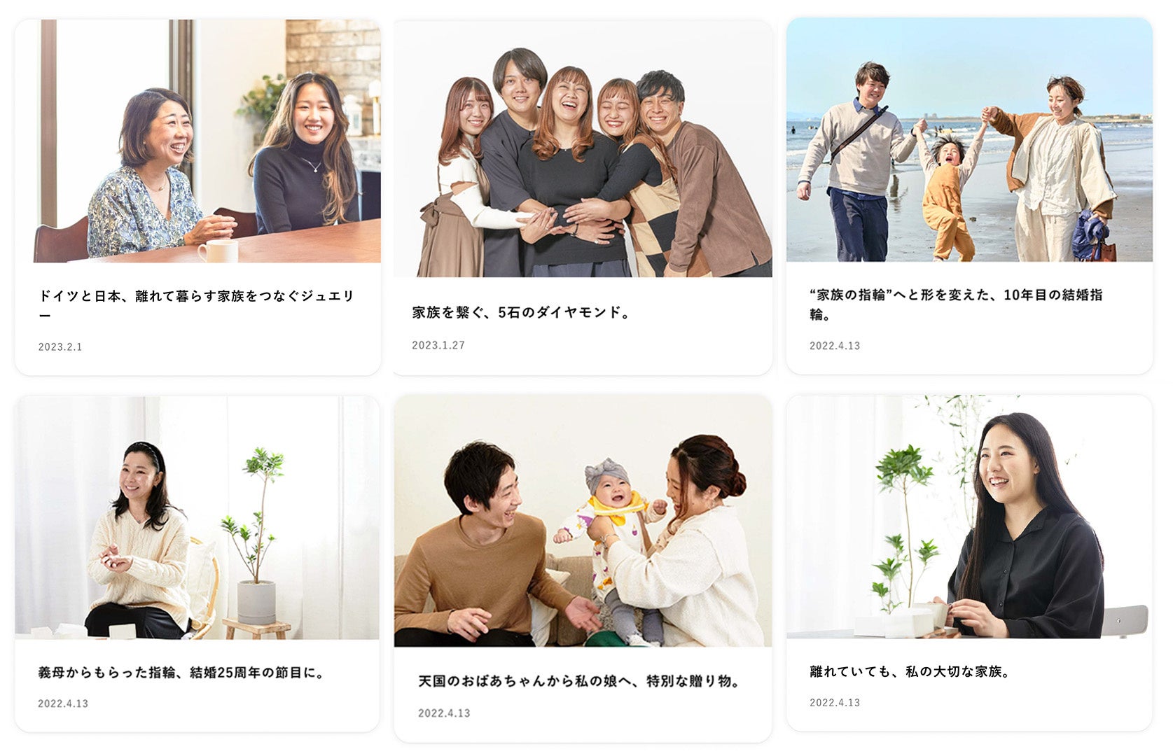 年齢・性別・生活環境も異なるさまざまな方から「ジュエリーリフォームに対するリアルな声」をお聞きし、リフォームを検討されている方に届けるべく始めたこの企画は、現在までに6組のストーリーを公開しています。