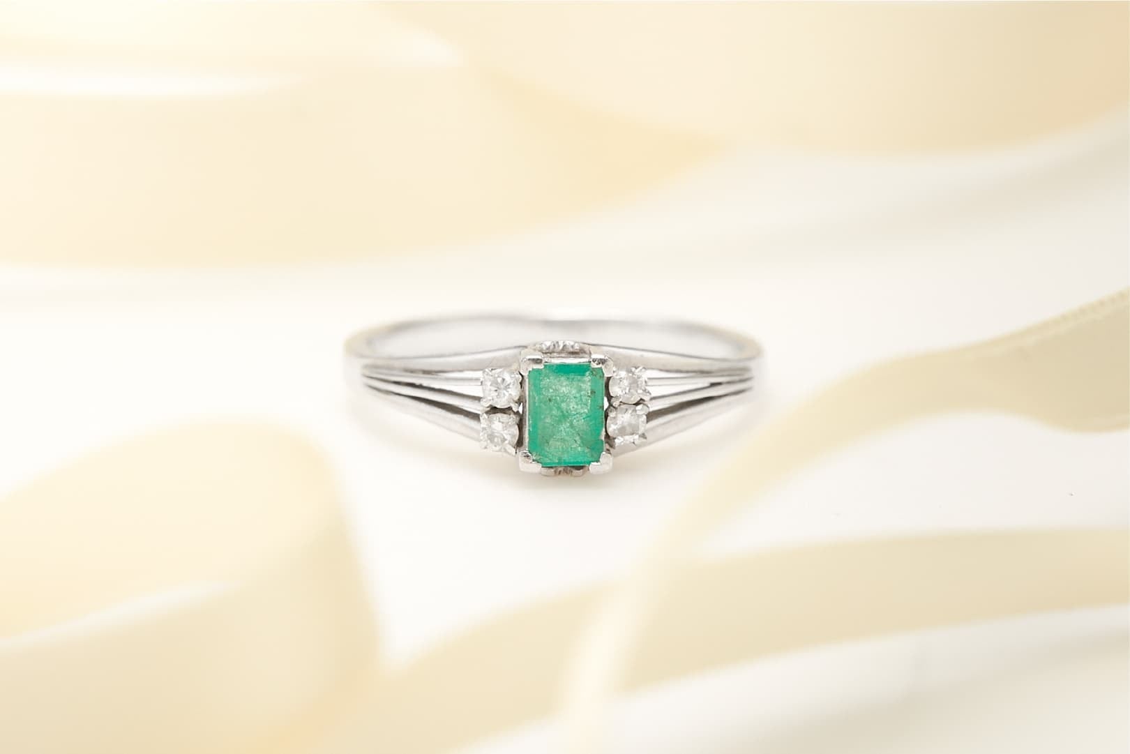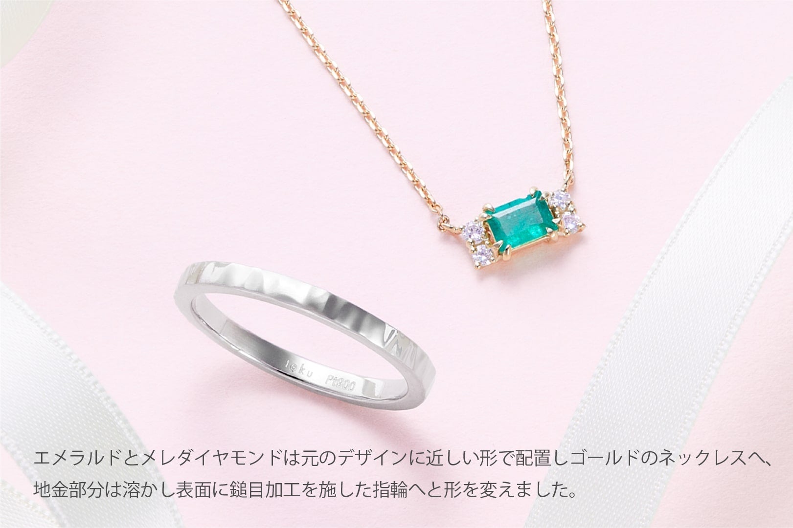 お義母様の誕生石エメラルドが留められた華やかなデザインの指輪は、お石はネックレスへ、地金部分は溶かしてシンプルな指輪へと形を変えました。