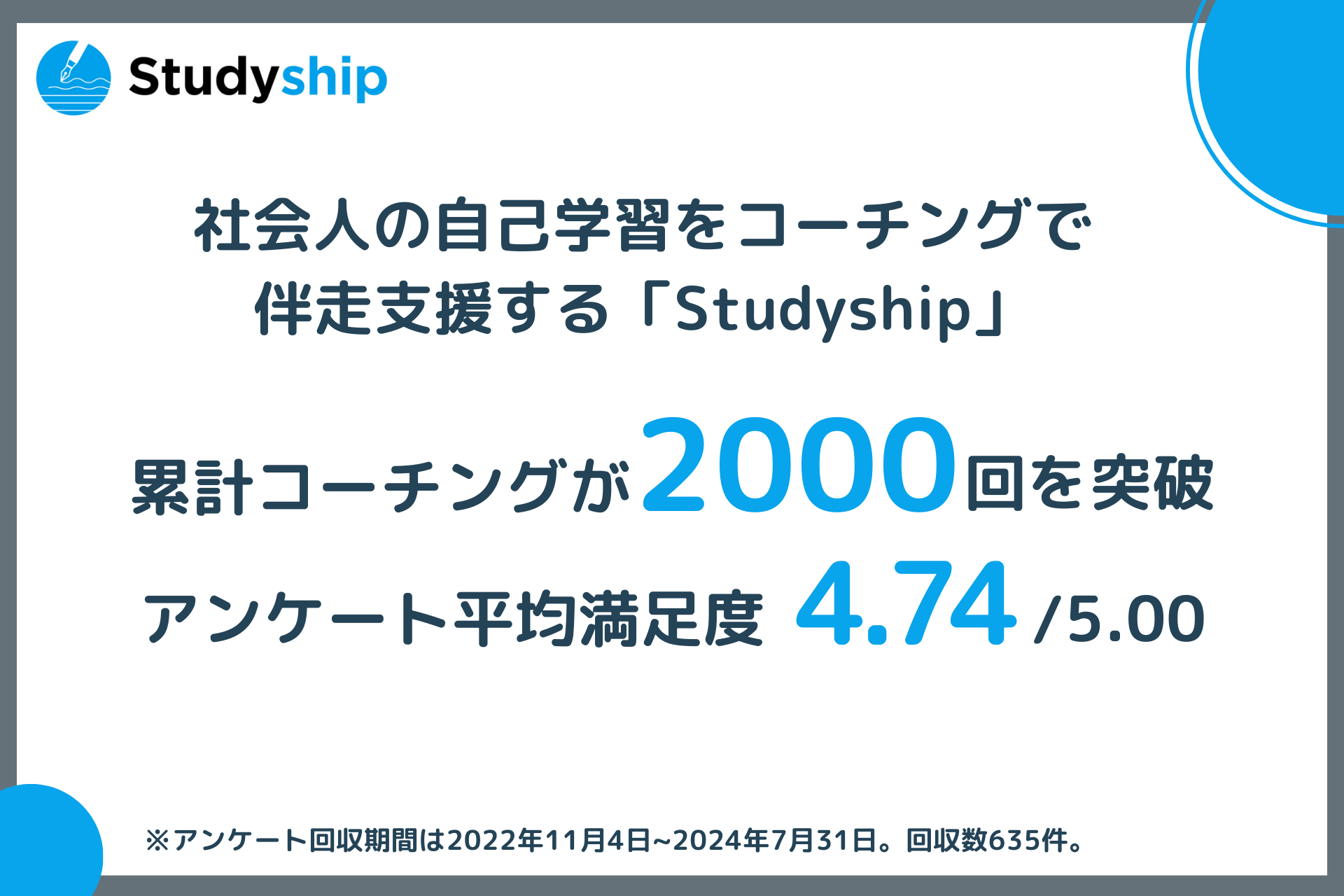 株式会社ピアコミット(代表取締役 大森圭将 / 東京都港区)が運営する「Studyship」の累計コーチングセッション回数が、2000回を突破したことをお知らせいたします。また、アンケート平均満足度(636件)は4.74/5.00という非常に高い評価を獲得しております。
