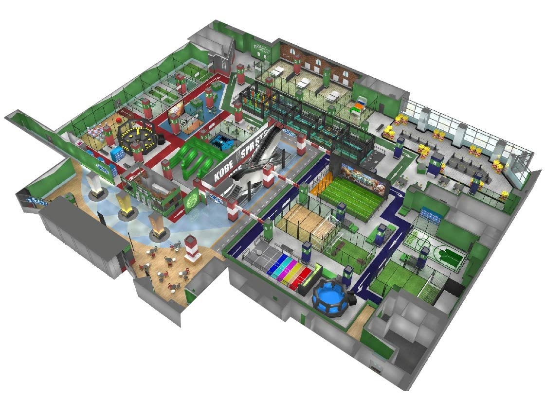 株式会社バンダイナムコアミューズメントの『トンデミ』『VS PARK』を手掛けたスポーツエンターテインメント施設の企画チームがプロデュースする大型スポーツエンターテインメント施設で、体を動かしながらまるでバラエティ番組に参加しているような体験ができる新感覚のスポーツエンターテインンメント施設です。施設がオープンする神戸市は学生が多く、メインターゲットである高校生や大学生を中心に小学生・中学生のお子様のいるファミリー層まで楽しめる“新しい屋内スポーツエンターテインメント”を提供致します。