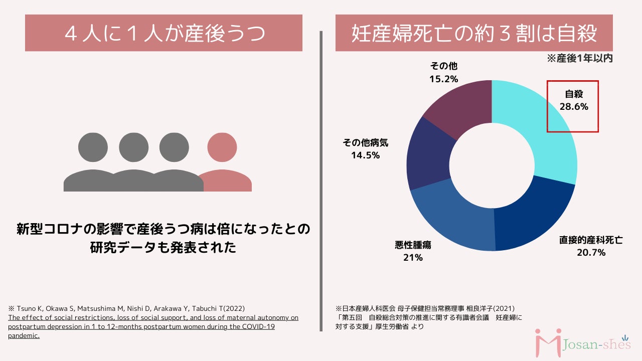 日本産婦人科医会によると、1歳未満の赤ちゃんの母親の産後うつ病の罹患率は10%といわれていますが、コロナ禍より4人に1人が「産後うつ」を発症している可能性があると指摘されています。