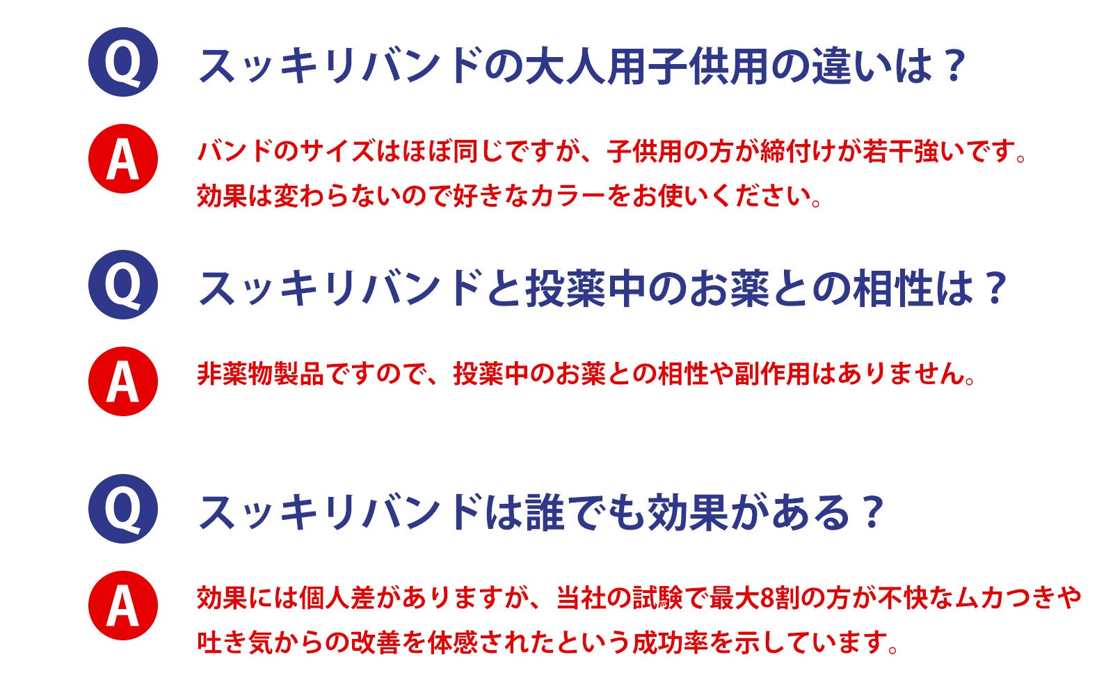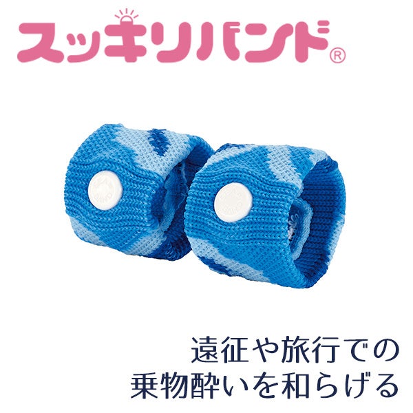 「スッキリバンド®」は、乗物酔いや緊張、二日酔い、様々なキモチワルイ不快感を軽減するツボとして効果的な“内関(ないかん)”を押すリストバンド状の一般医療機器です。繰り返し使用でき眠気などの副作用もなく、子どもから高齢者まで幅広い層にご利用いただいています。