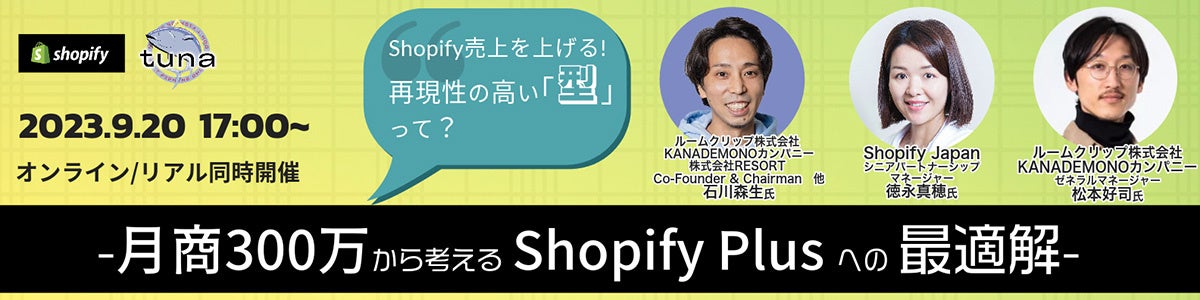 株式会社RESORT (本社所在地:東京都渋谷区東4-12-1 代表取締役 河野 裕太)のShopifyのEC構築パッケージサービス「TUNA」は、2023年9月20日(水)に『再現性の高いEC事業売上アップの方法』について解説する無料セミナーを開催いたします。