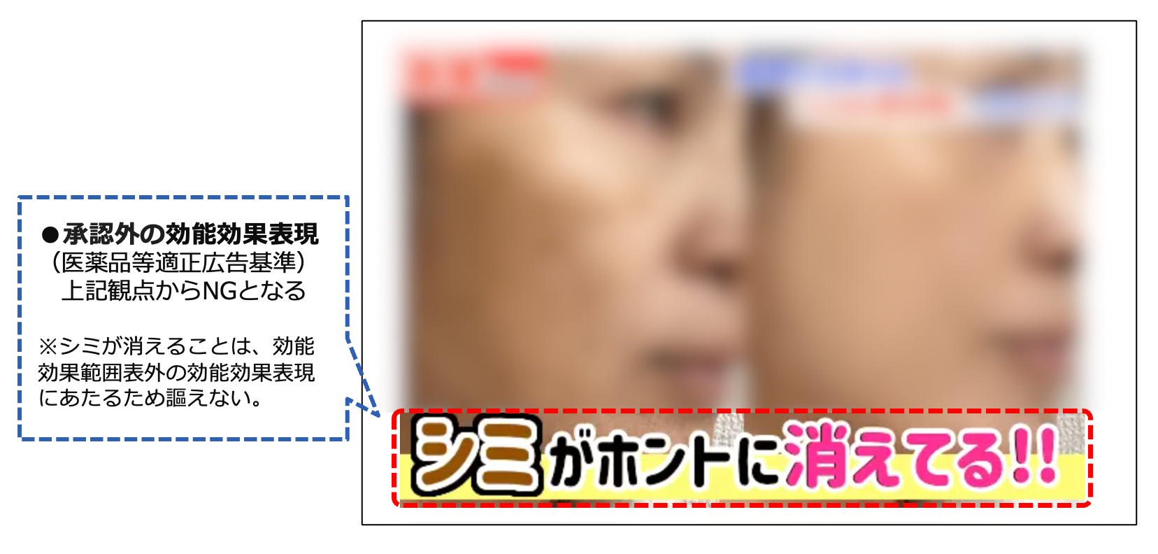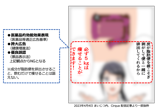 具体的には、ダイエット商材において「飲むだけで痩せる」「短期間で急激に痩せる」「飲むだけで脂肪燃焼できる」等の医薬品的効能効果表現に該当する表現がなされていたり、化粧品に分類される商材において「シミが消える/なくなる」「シミの漂白剤」等の承認外の効能効果表現に該当する表現がなされていたり、薬機法違反となり得る表現を多く確認しています。