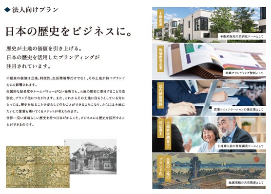 法人のお客様向けには、土地の歴史を通して日本の歴史を活用したブランディングの提案をいたします。地域密着企業、地方銀行、信用金庫、士業、不動産業者、等の企業が対象となります。