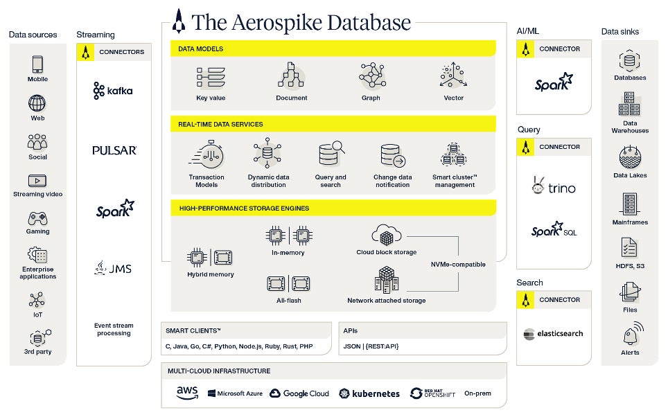 Aerospikeは、キーバリュー、ドキュメント、グラフ、ベクトルを有するマルチモデルデータベースです。これにより、Aerospike単体でオンライントランザクション処理、データ分析、AI/ML(人工知能/機械学習)といったあらゆるユースケースに対応することができます。