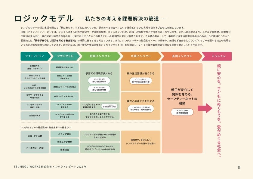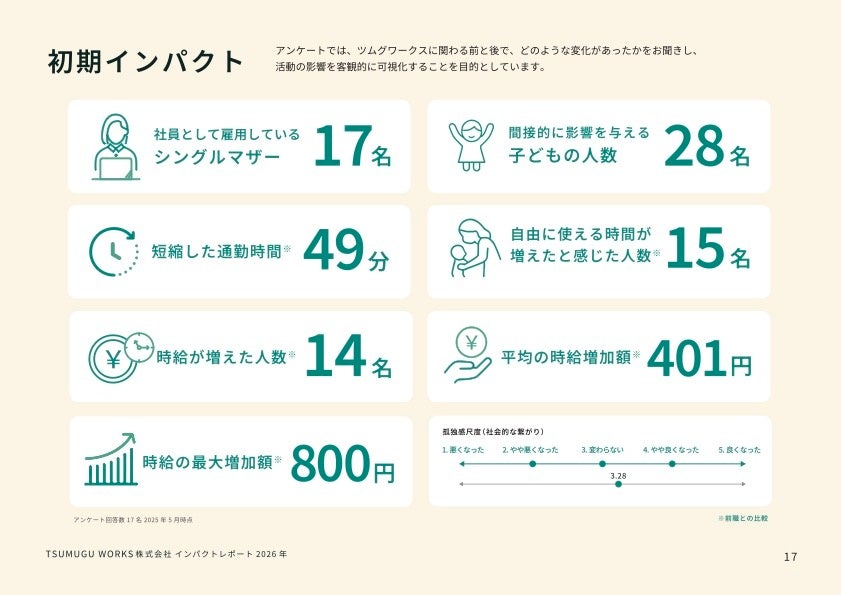 シングルマザー等の就労支援およびバックオフィス代行事業を展開するTSUMUGU WORKS株式会社(本社:東京都新宿区、代表取締役:小原 光弘)は、自社事業が社会に与えた影響を定量 / 定性の両データで可視化した「インパクトレポート2026年」を公開いたしました。