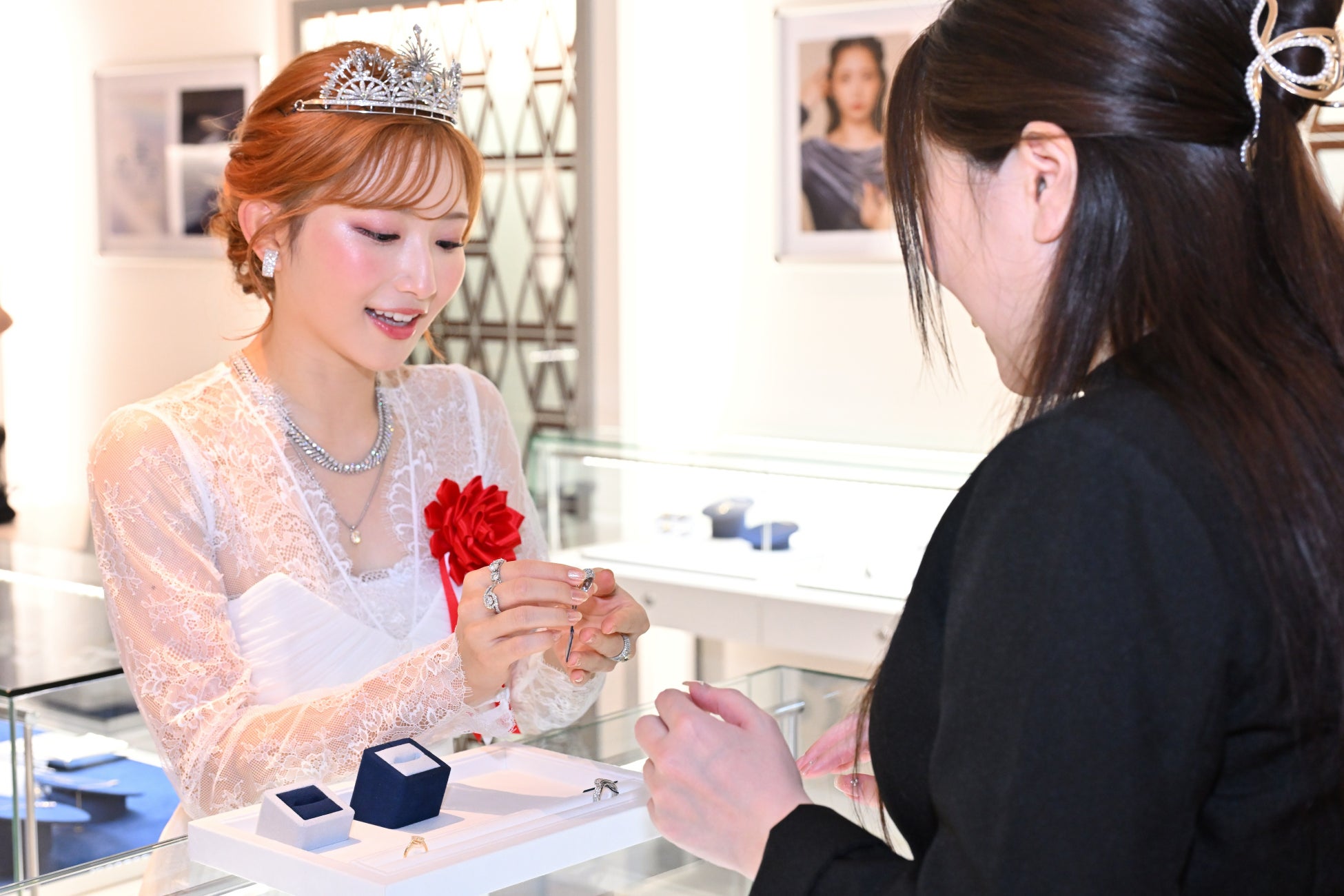 イベントの後の質疑応答に対して青山なぎささんは、「今期は就任5期目で、普段よりプライベートでもオーバーエクセレントのジュエリーを愛用しています。」またイベントでの高額ジュエリー着用について「輝きが凄くて、身に余る体験をさせていただきました」と強く感動した様子でした。就任当時から商品開発を一緒に行ってきたコラボジュエリーも毎回好評いただいております。