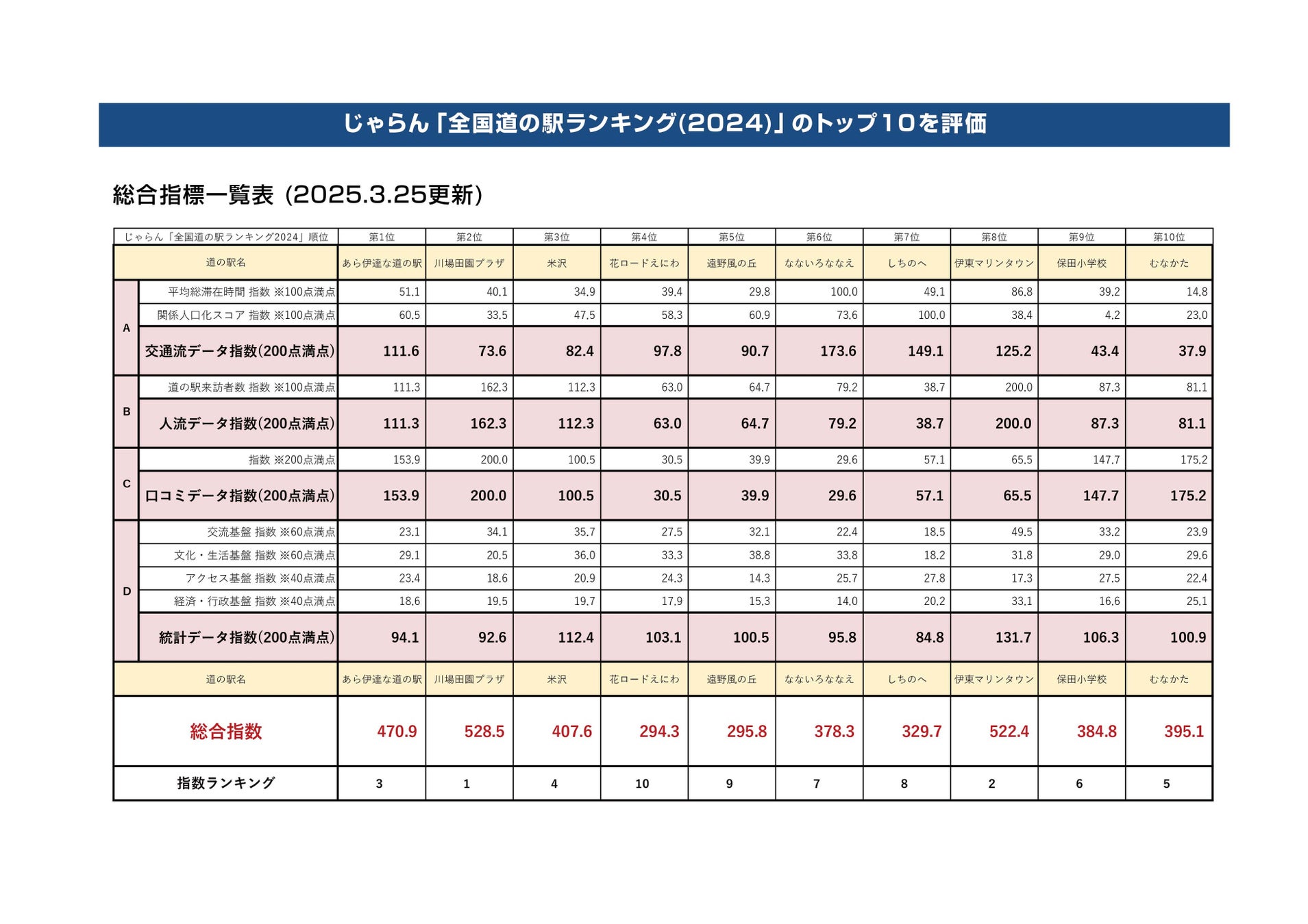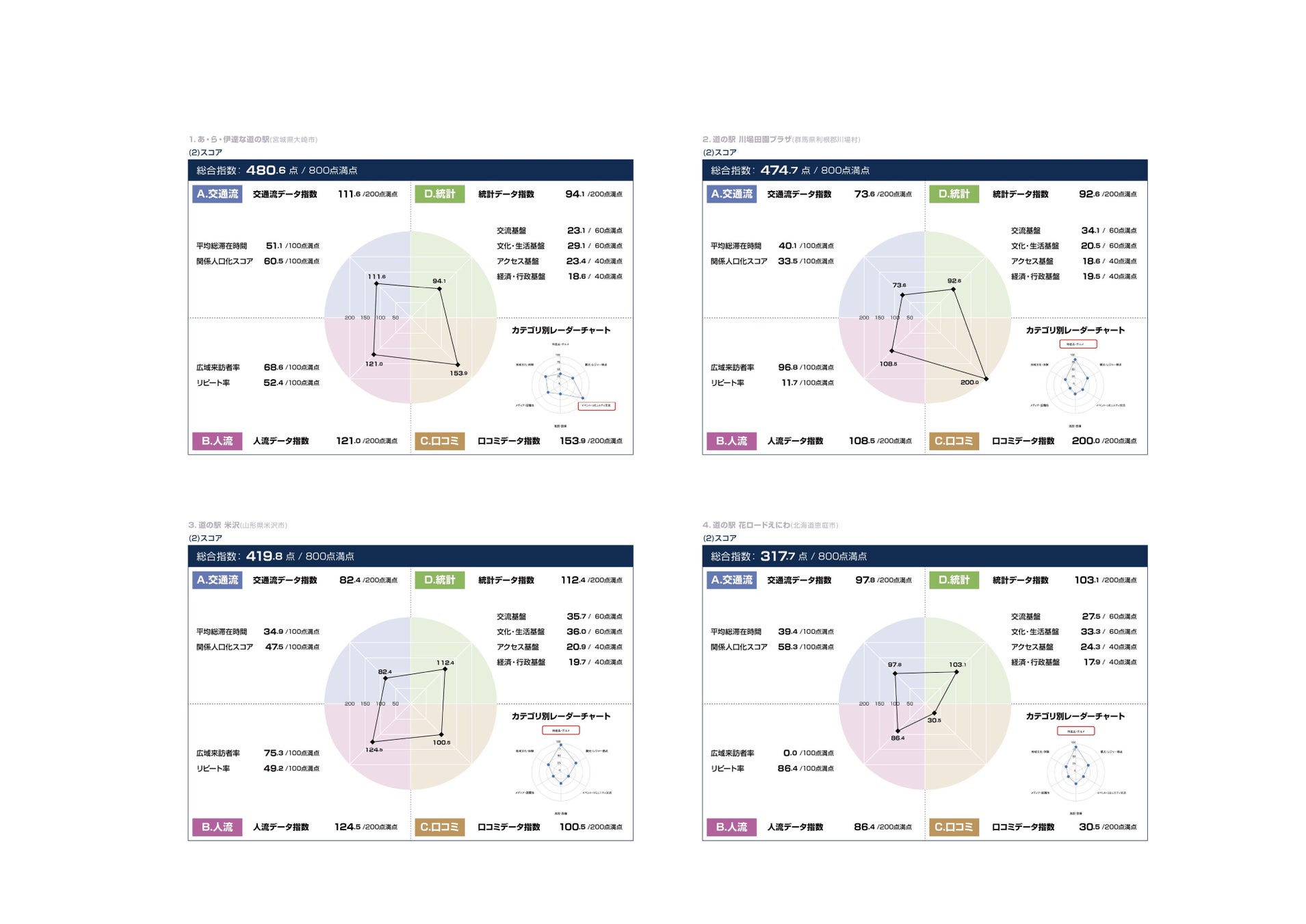 評価事例として、「道の駅ランキング(じゃらん)」のベスト10駅についてのカルテを作成しました。従来のアンケートによる人気ランキングとは異なる順位付けとなり、次世代に向けた道の駅の可能性と課題が浮かび上がらせることが出来たと認識しています。