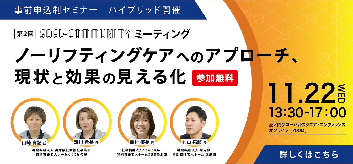 この「SOEL COMMUNITY」は、ノーリフティングケアの導入・定着を志す介護施設等の結びつきの場であり、SOEL 製品をご使用中の介護施設に限らず、この製品の導入を検討中等の介護施設もご参加可能です。