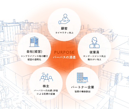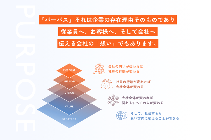 「パーパス」は、企業の存在理由そのものであり、従業員へ、お客様へ、そして社会へ伝える会社の「想い」でもあります。会社の想いが伝われば社員の行動が変わる。社員の行動が変われば、会社全体が変わる。会社全体が変われば、関わる全ての人が変わる。そして社会さえも良い方向に変えることができる。パーパスが浸透することで、会社全体が、ひいては社会全体が変わる。私たちはそう信じています。
