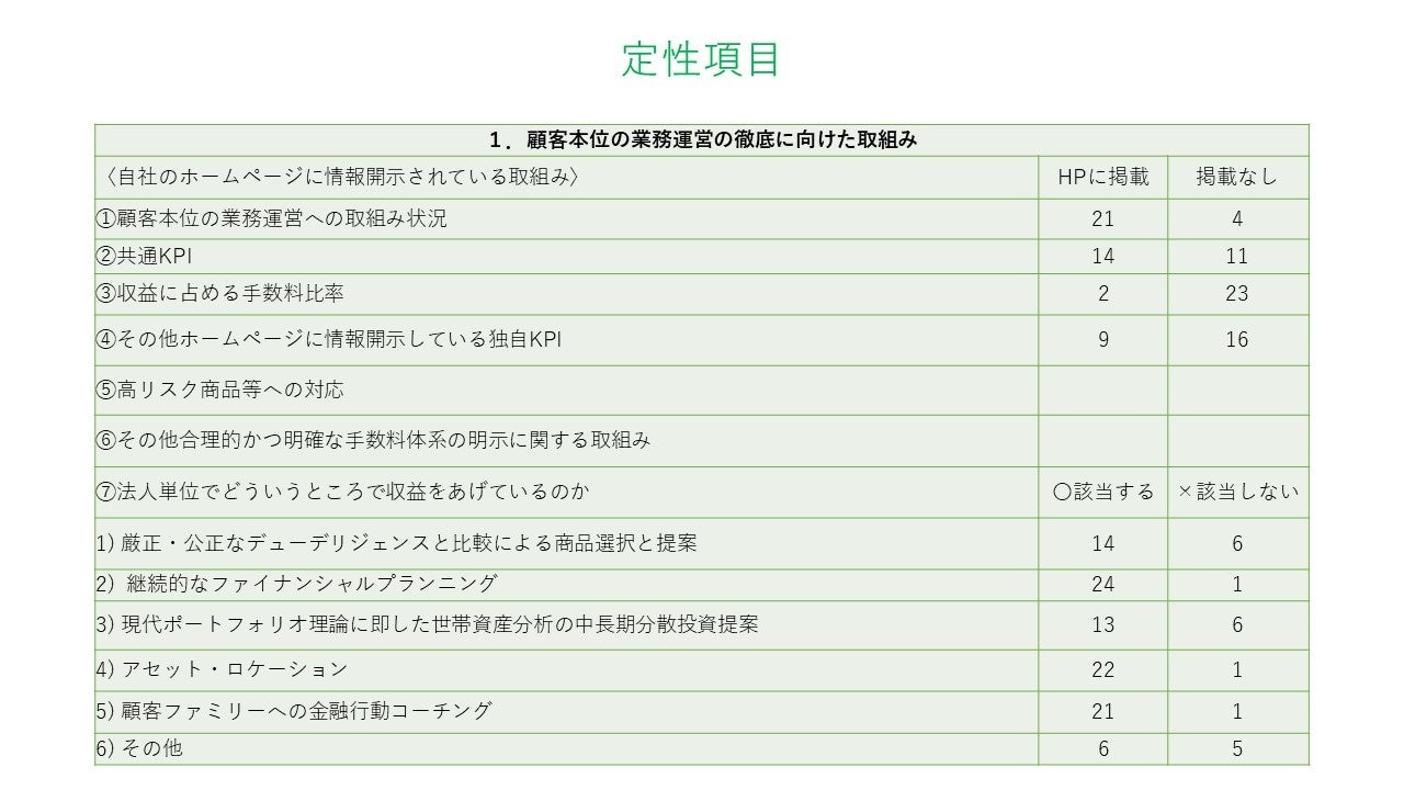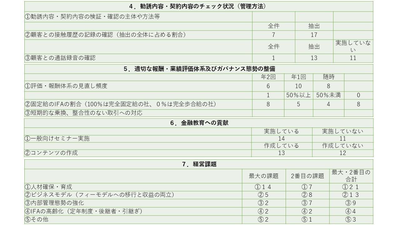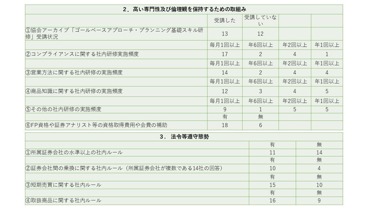「顧客本位の業務運営」の徹底に向けた取組み状況や各種コンプライアンス態勢・その他経営課題等に対する意識・取組みについて調査を実施。自社のホームページへの情報開示状況、各種社内研修の実施頻度、資格取得費用等の補助の有無、社内ルールの実施状況、勧誘・契約内容のチェック状況、評価・報酬体系の整備状況やセミナー・コンテンツの作成状況等がより明確となった。