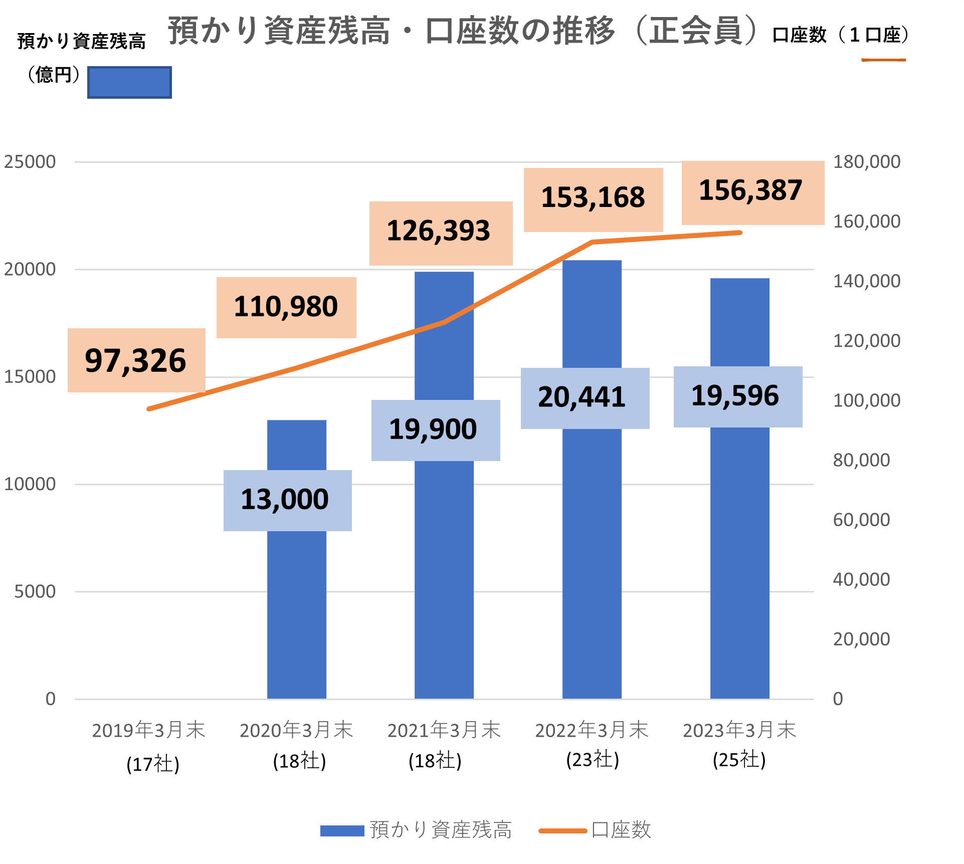 ⼝座数が増加し預かり資産が微減。2023年3⽉末時点で15.6万⼝座、1兆9596億円。比較的規模の小さい会員が増加したことも背景に。