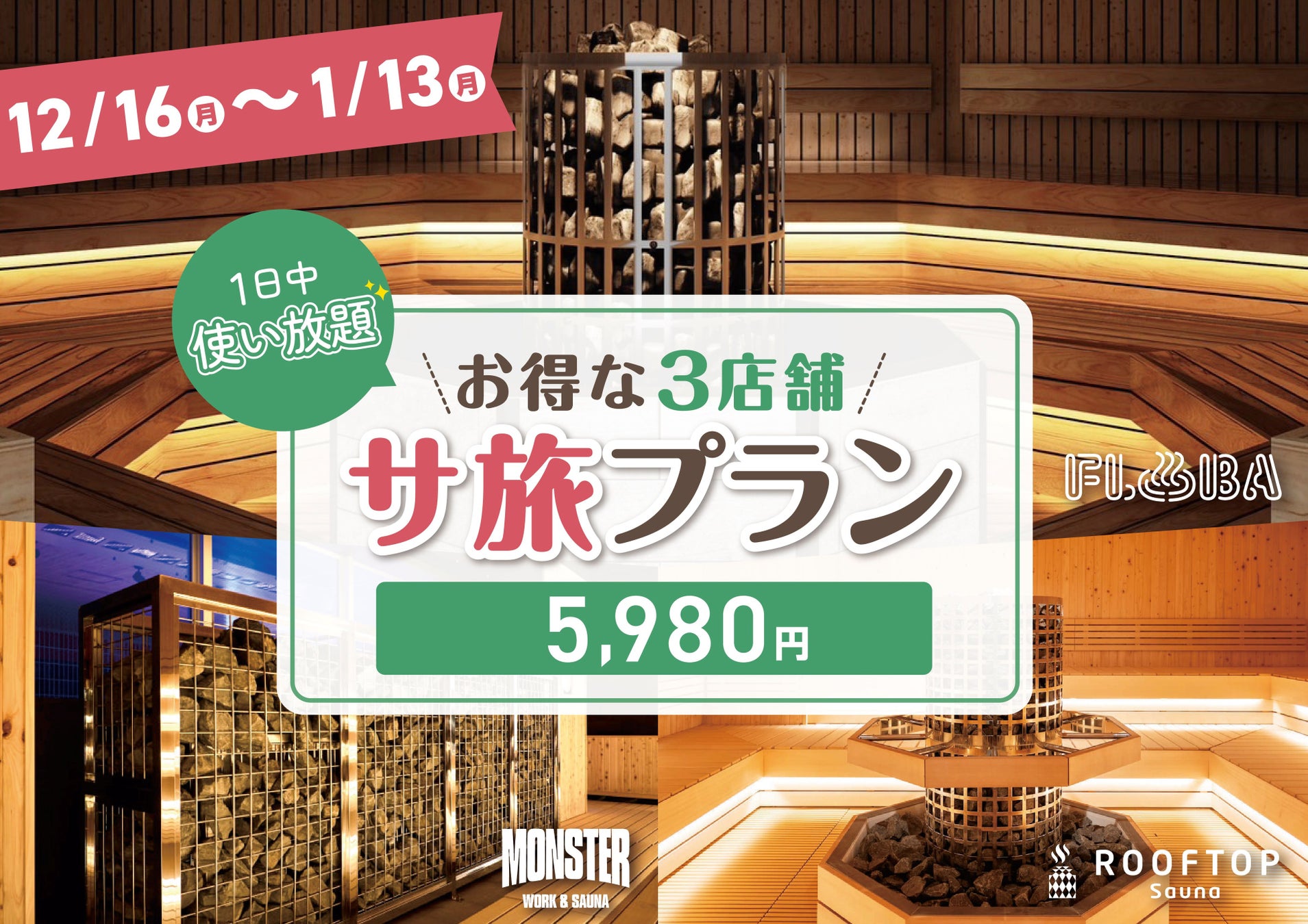 『FLOBA』『MONSTER』『ROOFTOP/LifeWork』3店舗のサウナ・ラウンジが使い放題の、お得な1dayプランを5,980円(税込)でご用意。