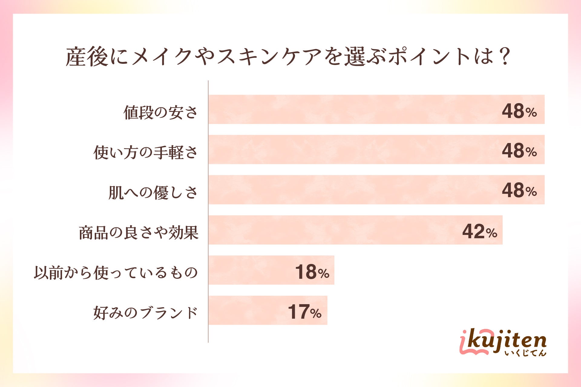 「値段の安さ」「使い方の簡単さ」「肌への優しさ」がそれぞれ48%で、産後の時短メイクや赤ちゃんと触れ合うことを想定して選んでいる人が多いことが分かりました。
